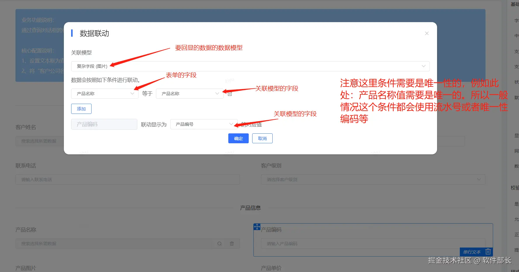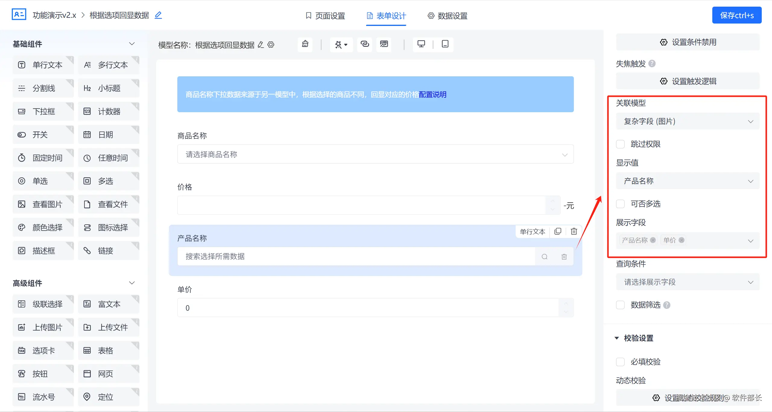 根据其它组件的数据值作为查询条件,在其它数据模型中进行搜索,关联查询出某个字段的值,显示在当前组件