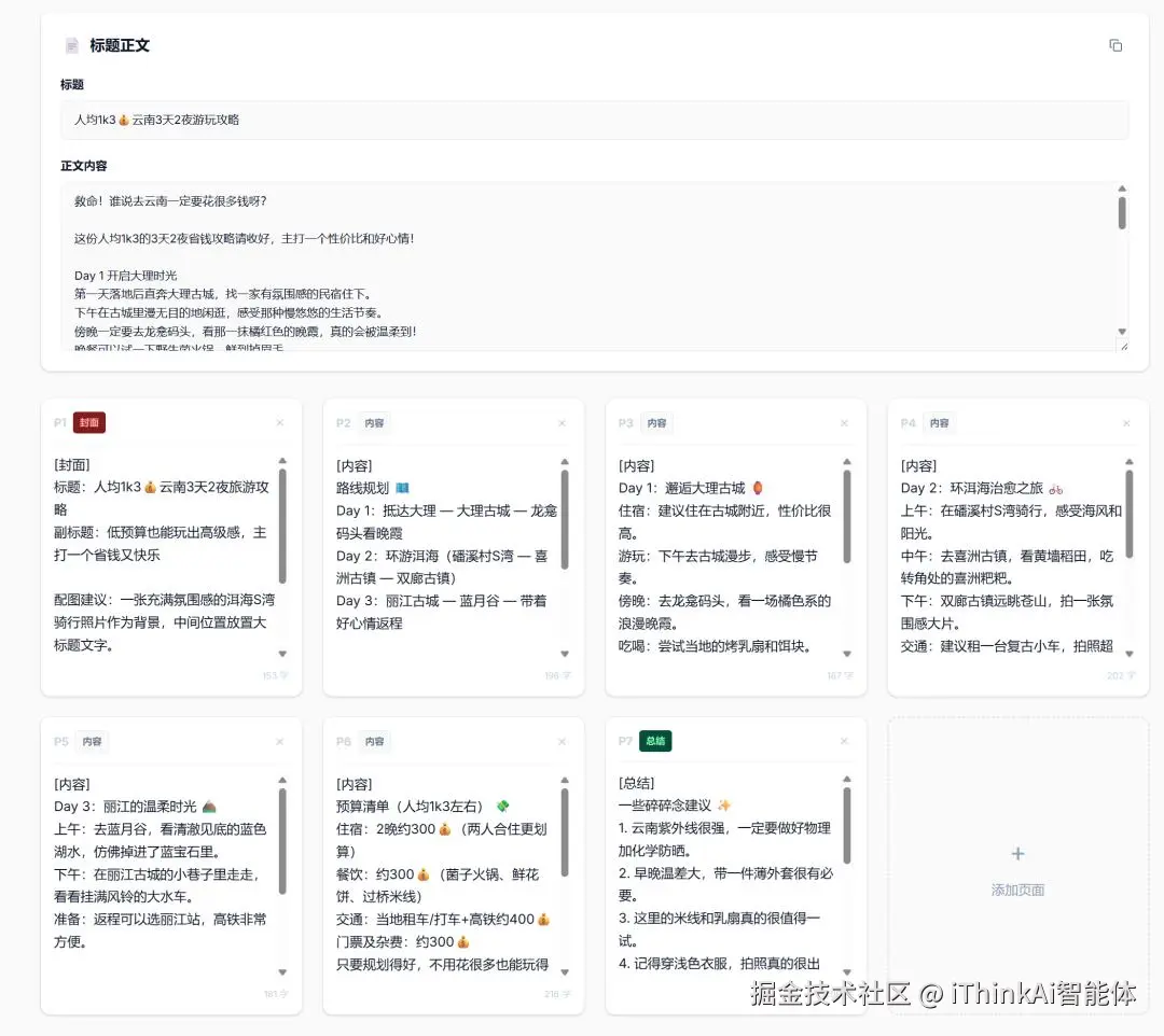 •第一步:输入主题或参考图 你只需要输入一个简单的想法,比如“昆明大理 5 天旅游攻略”,或者直接上传一张你觉得不错的参考图,它就能精准抓取风格。