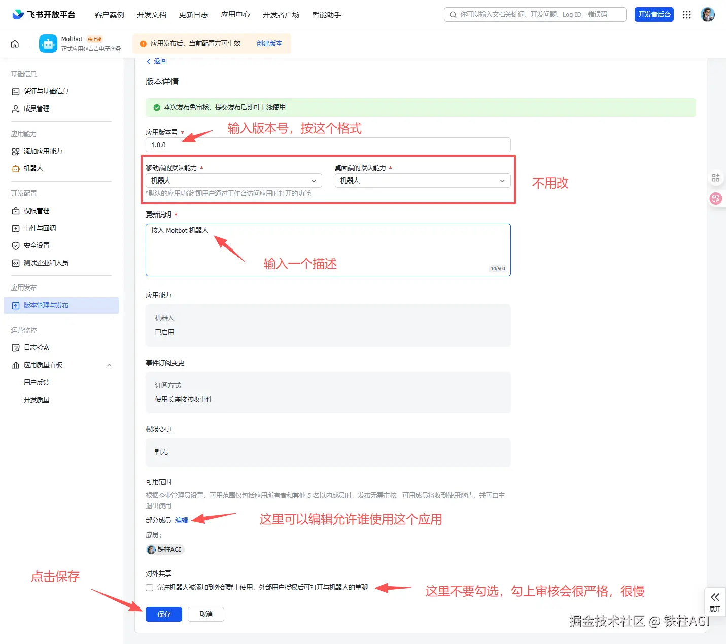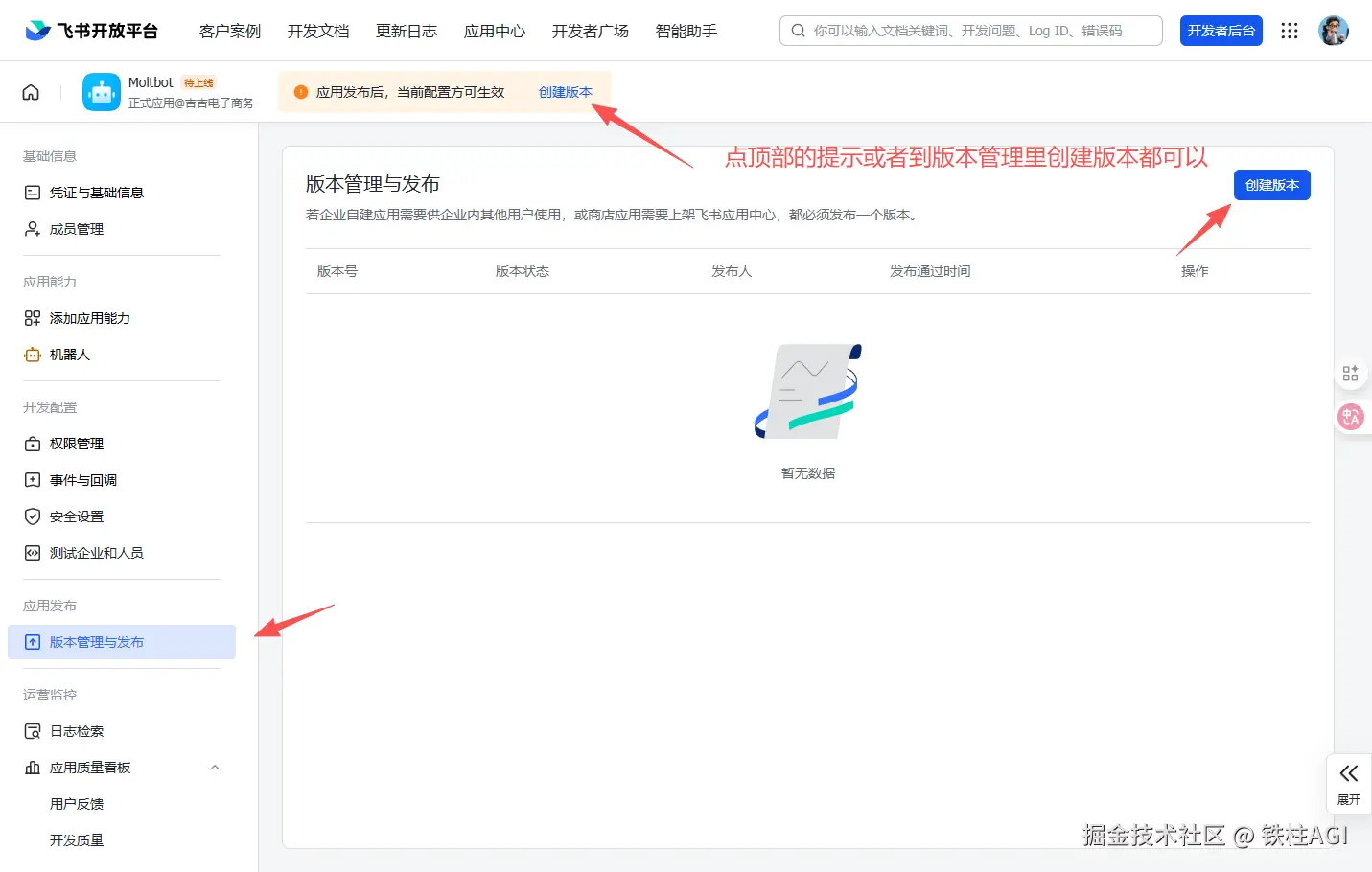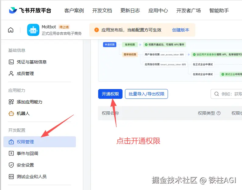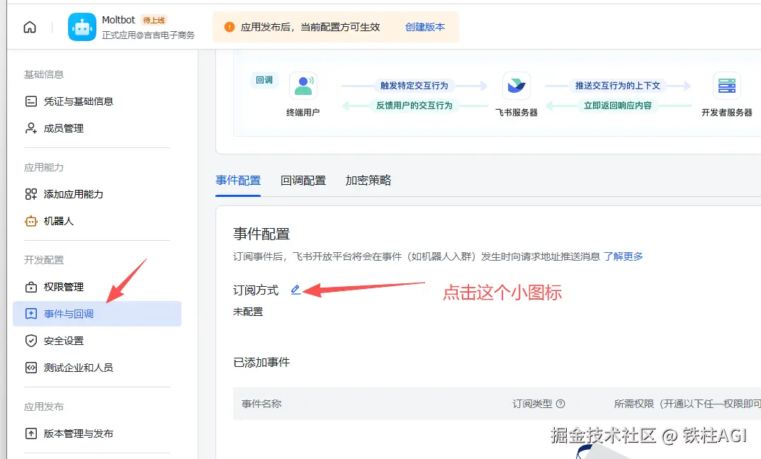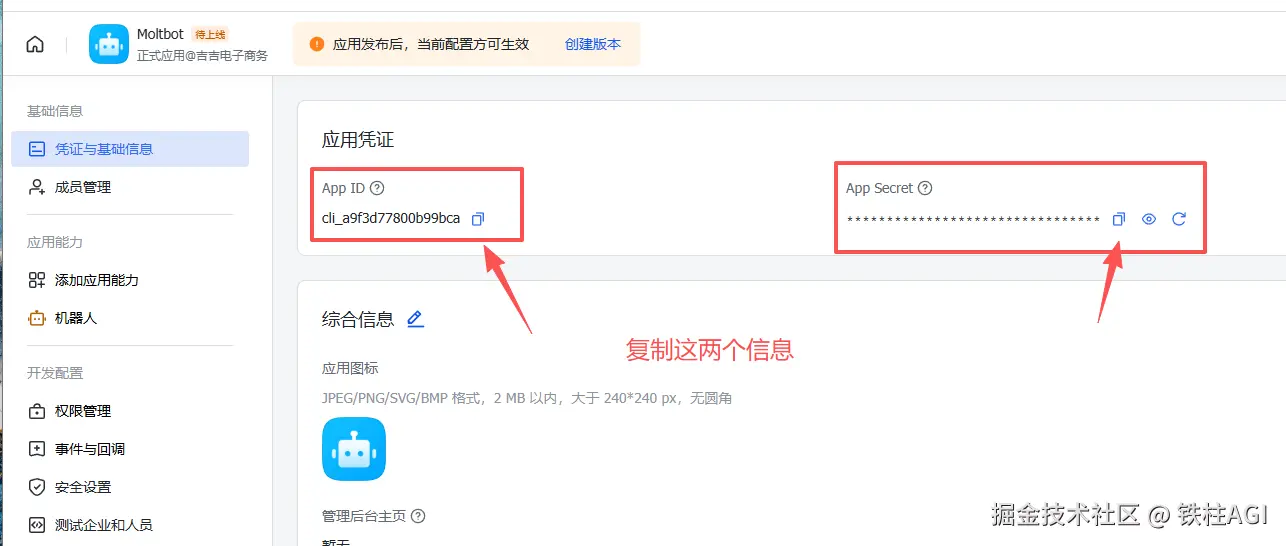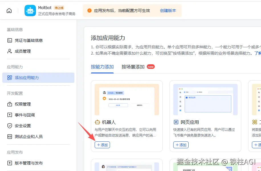 ⚠️ 重要: 所有配置修改必须通过「创建版本」并发布后才能生效。