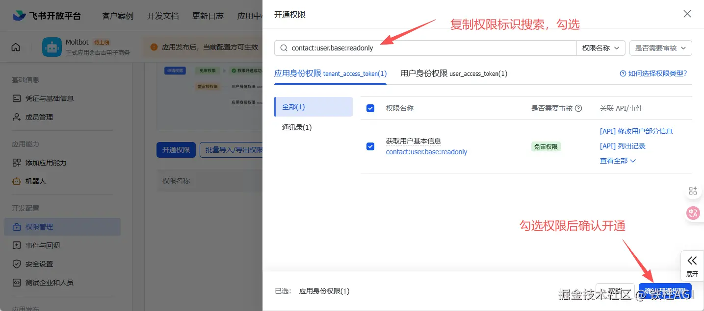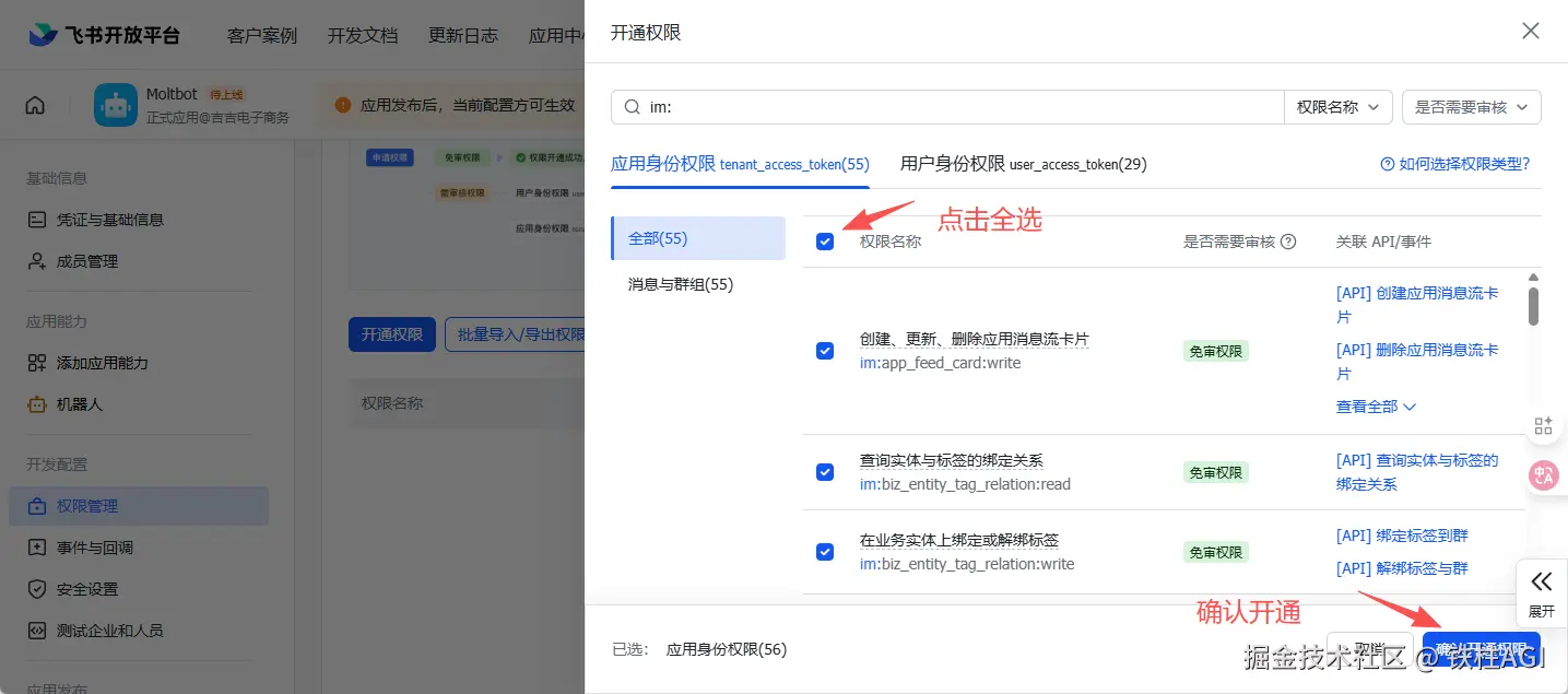 想省事儿一点就是搜索 im: 开头的权限全勾选开通即可,再加一个 contact:user.base:readonly 权限单独开通