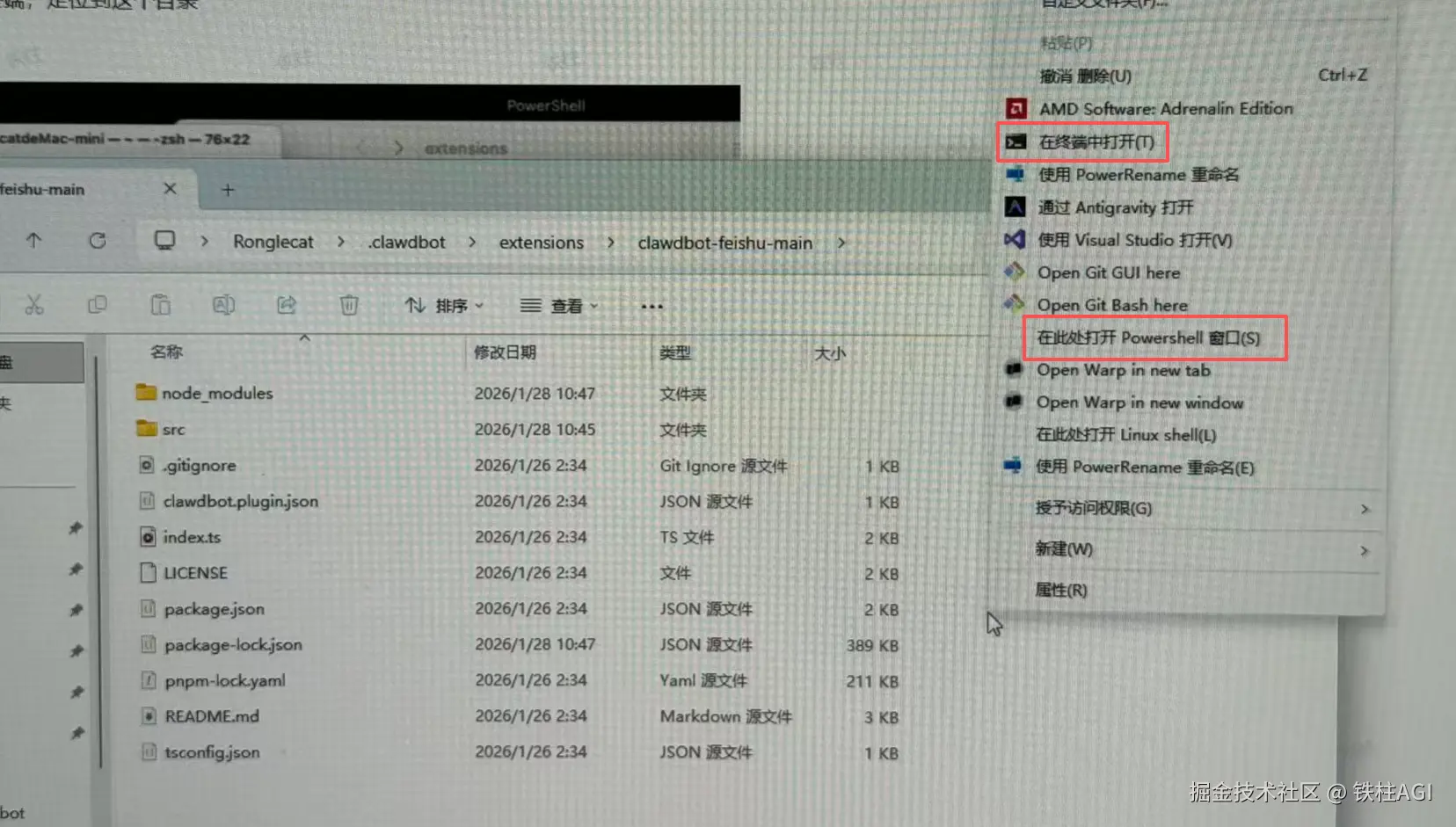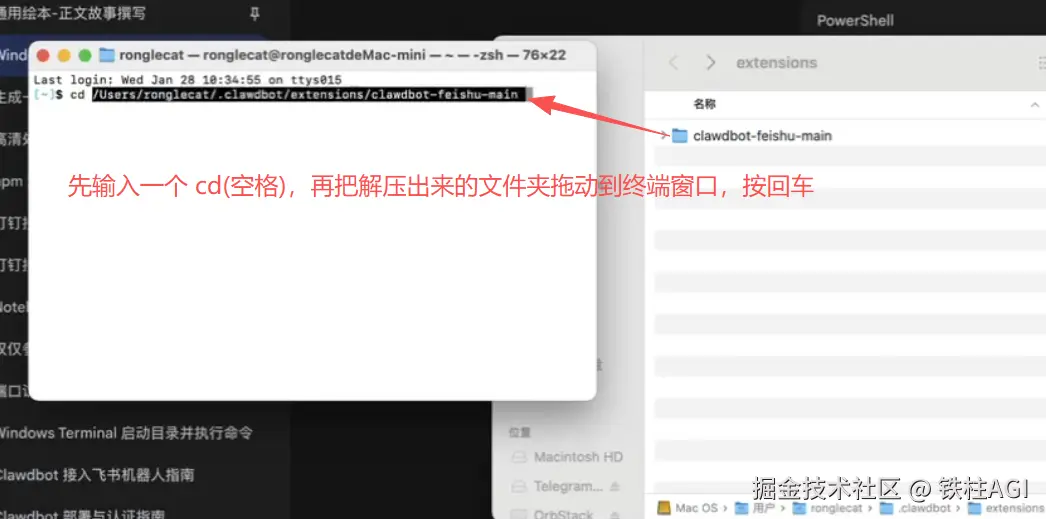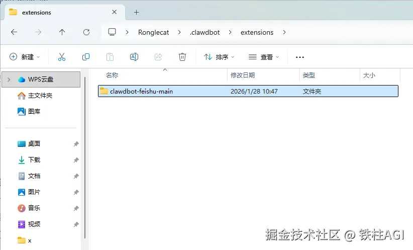 上面的命令执行后会在 Moltbot 的配置文件夹内创建扩展(extensions)文件夹并且通过系统资源管理器打开这个文件夹,把下面的飞书插件源文件解压到扩展文件夹下。公众号回复“飞书插件”获取插件压缩包文件