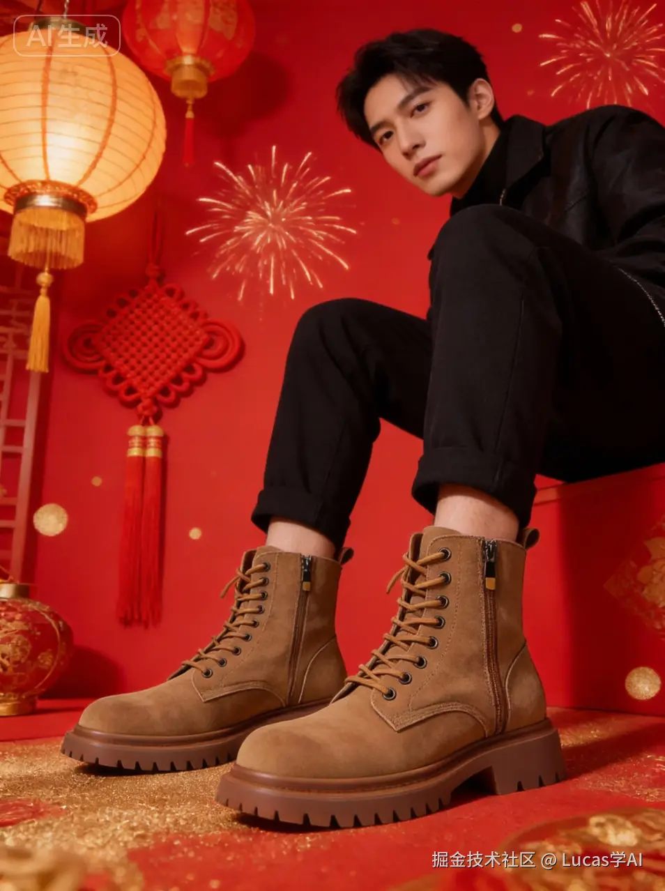中国春节年货节电商促销风格,增加一个模特穿鞋演示,红色为主色调,金色点缀,喜庆但不俗,背景有灯笼、中国结、烟花元素,整体高级商业视觉风格,适合电商主图与详情页