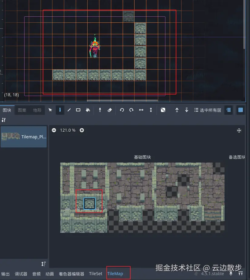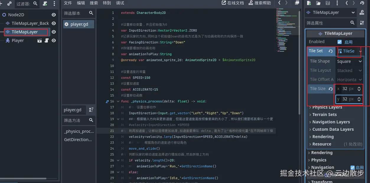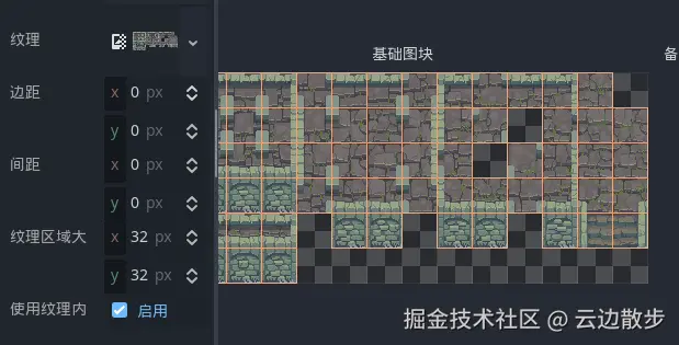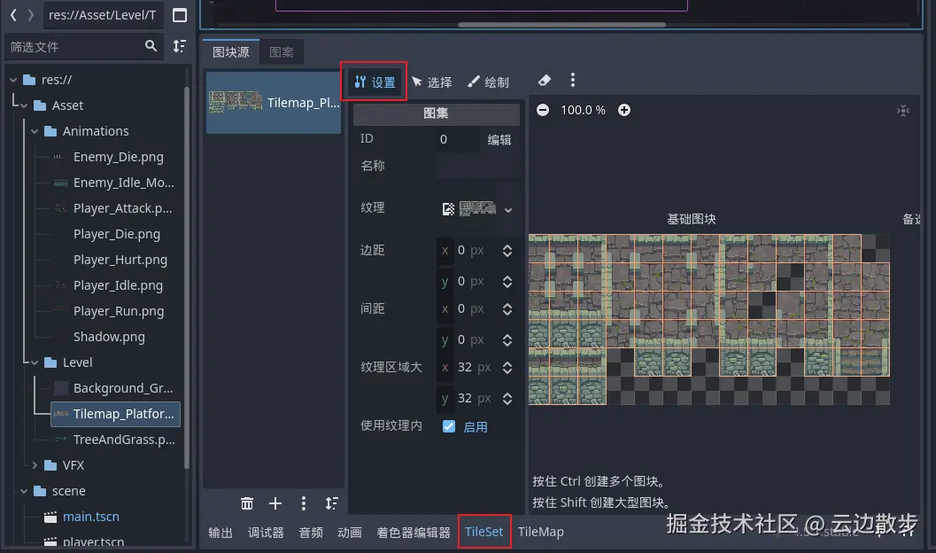 - 创建与调整:在主场景根节点新建瓦片地图层,移至玩家场景上方,建 32*32 尺寸瓦片集,拖素材文件设瓦片源。