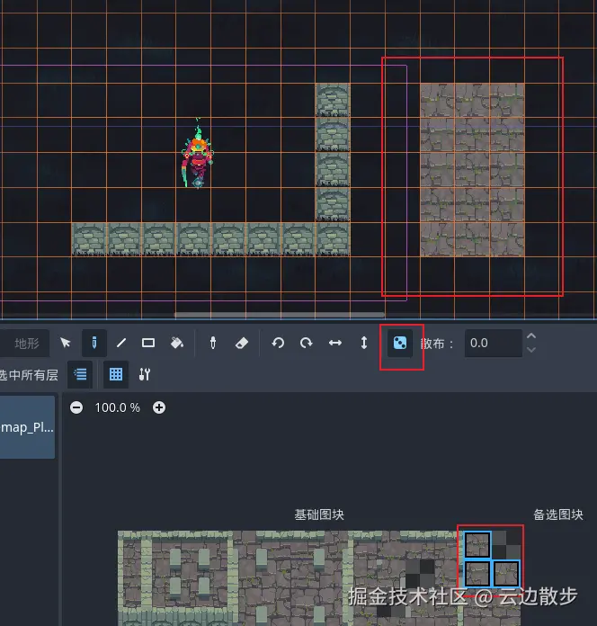 - 然后我们切换回瓦片地图层那里随便选择一个瓦片,我们就可以在观察窗上进行绘制我们的地图关卡了,但是这种一点点绘制实在效率太低了,所以我们采取一些其他方式