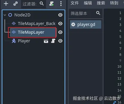 - 然后我们新建的瓦片地图层会在玩家场景的下面,我们需要移动这个节点到玩家场景上面,不要遮挡玩家角色