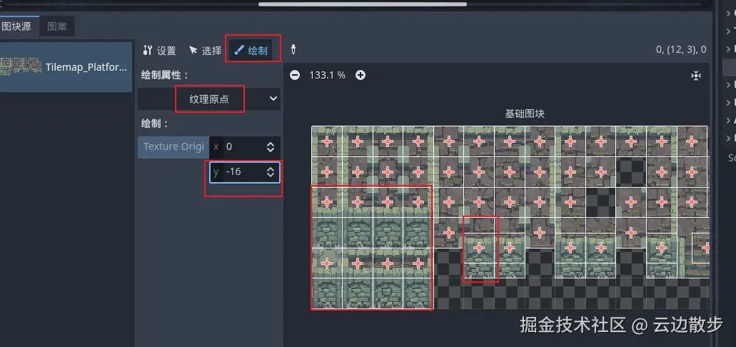 - 要处理这个问题,我们点击进入绘制模式,然后将绘制属性改为纹理原点,然后改y轴为-16之后,依次点击我们的组合瓦片,像图中的左边的瓦片组合我是点过了,然后就是正常了,不正常的就是那个红色的十字不是在一块的中间。