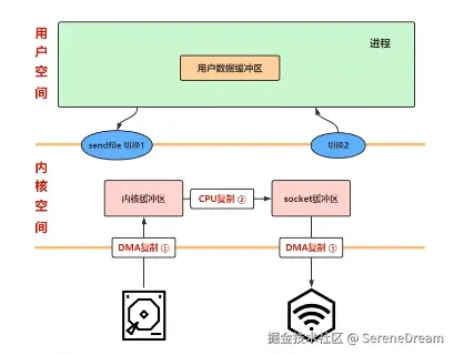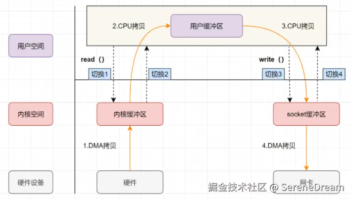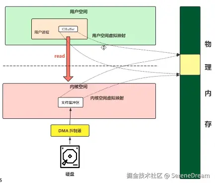 传统的 I/O 模式读取数据使用 read() 命令,当进程需要读取某个文件时,会调用 read() 函数, CPU 在读取到 read() 函数之后会将该进程阻塞,然后转变为内核态,DMA 接收到请求之后就会开始从磁盘中读取对应的文件并拷贝到内核缓冲区,此时 CPU 会转变为 用户态,去处理其他进程,当 DMA 拷贝完成之后,会将信息传递给 CPU 引发中断,CPU 会转变为内核态,将对应的文件拷贝到用户内存中,随后转变为用户态,开始继续执行对应进程的任务