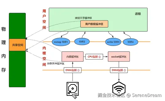 内存映射,即在进程需要对应数据时先将对应的数据标注为已有,如果进程想要调用对应的数据就会引发缺页错误从而使 OS 中断 CPU 然后从磁盘中获取对应的数据放入内核缓冲区,而用户内存中的映射则表示进程可以直接通过映射修改内核缓冲区中的数据,牺牲了一部分的安全性(不影响使用)但是提升了巨大的性能,CPU 也不需要进行数据拷贝这一个浪费性能的活动了