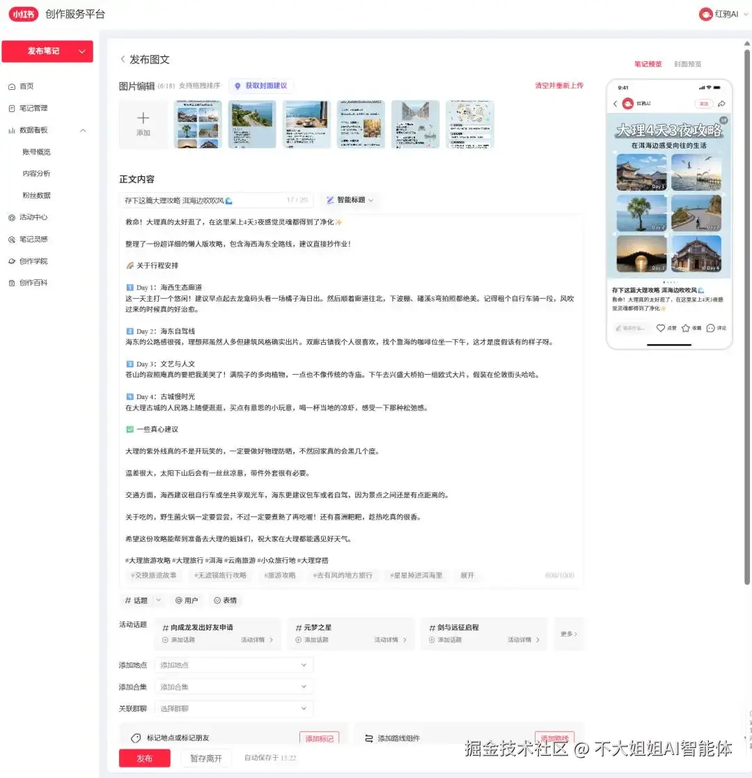 以前我们要一张张找图、修图,现在通过 红鸦 AI 这种生产力中枢,可以实现 批量做图文。尤其是针对当下爆火的小绿书(公众号图文版块),通过 一句话生成小红书/小绿书图文 的逻辑,极大压缩了内容交付的成本。