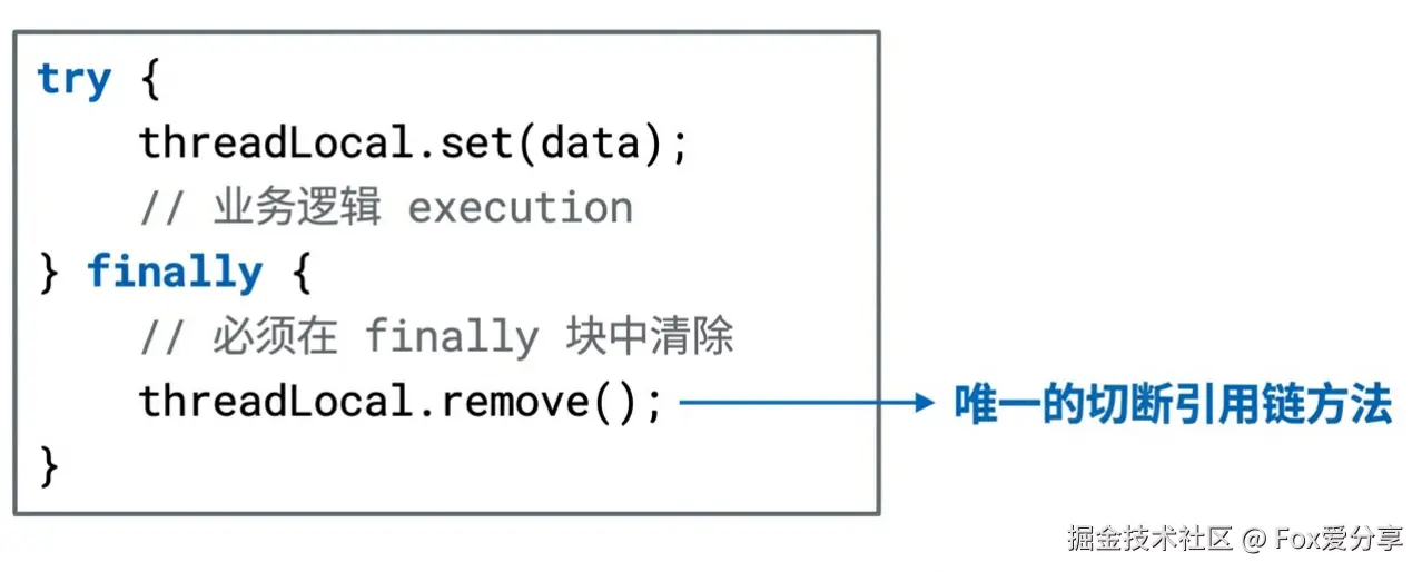 finally块中显式调用ThreadLocal.remove(),这是切断这条引用链的唯一方法。”
