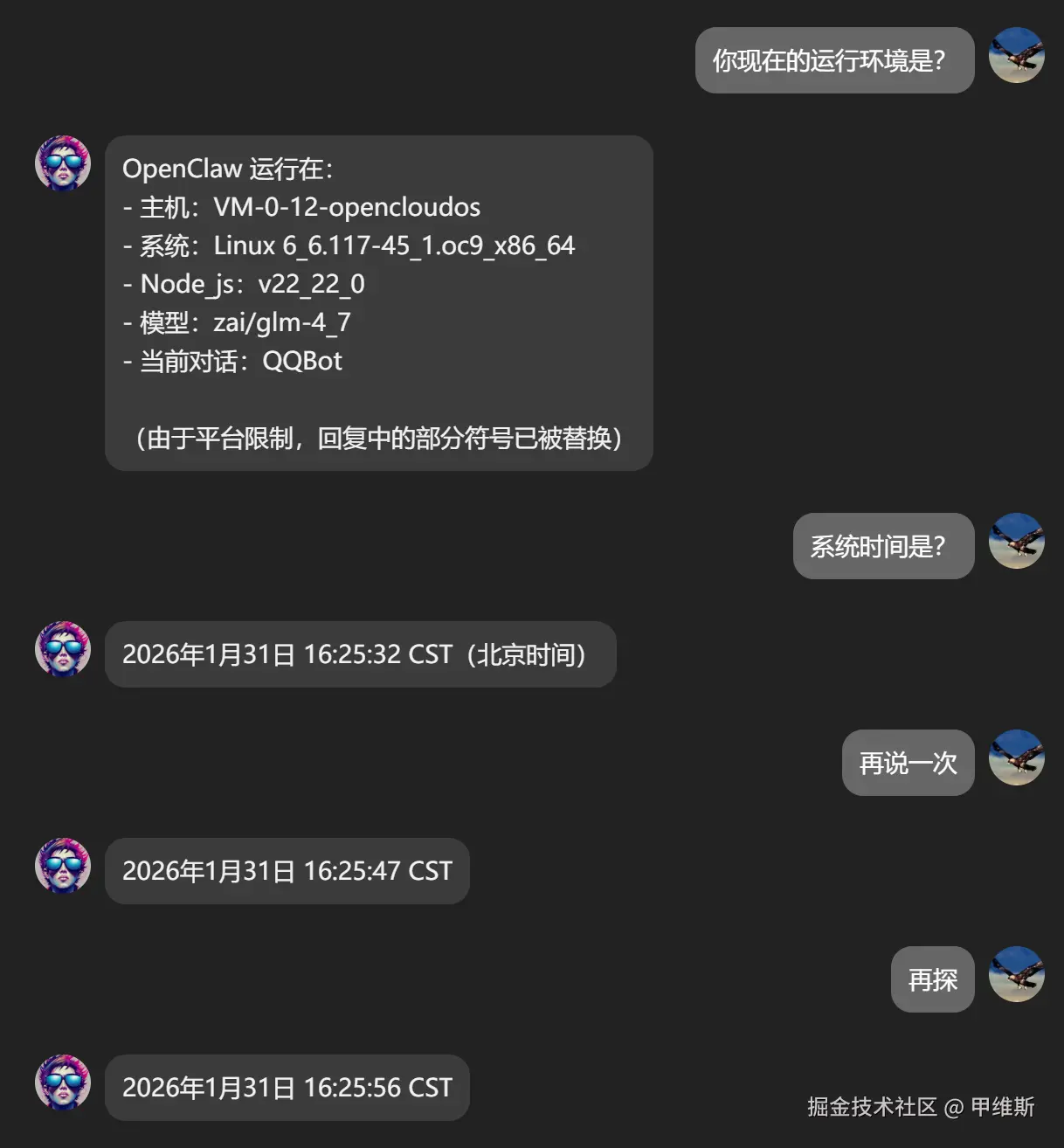 你直接可以在 TUI 里面对话,也可以用 QQ 进行对话,TUI 里面会同步显示。