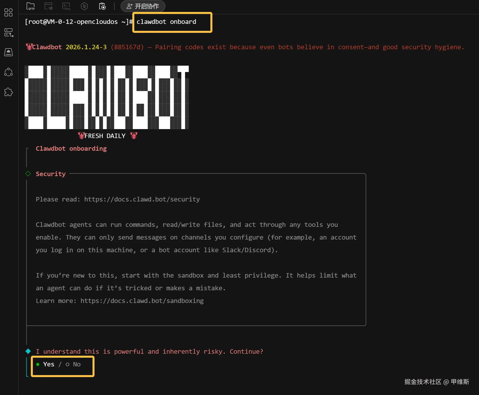 首先是输入命令 clawdbot onboard: