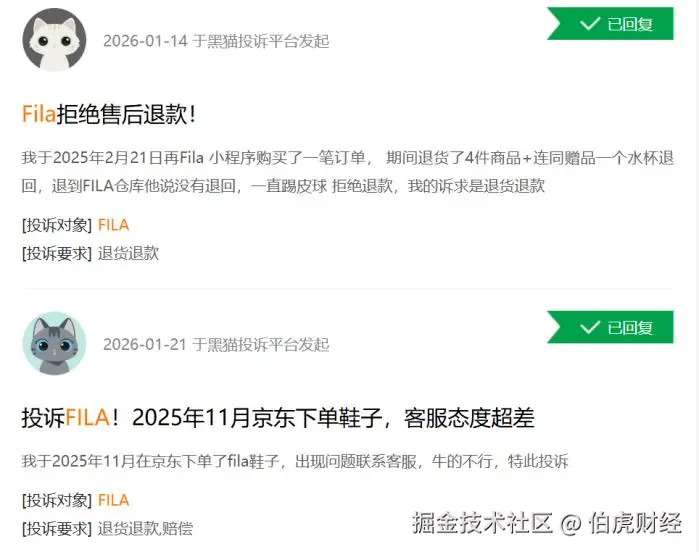 在黑猫投诉平台上,关于FILA的投诉有接近9000条,不少用户投诉FILA“客服态度差”“售后推诿”“产品质量差”等问题。