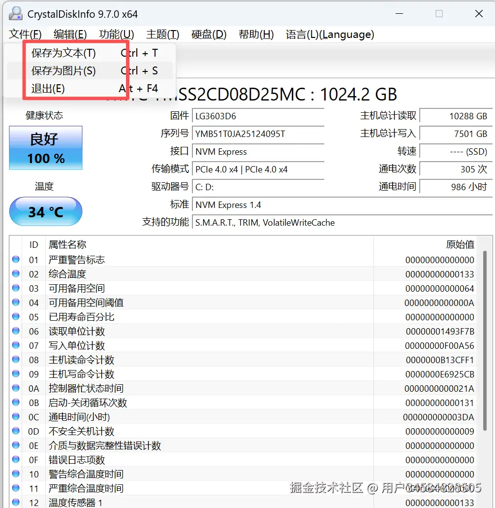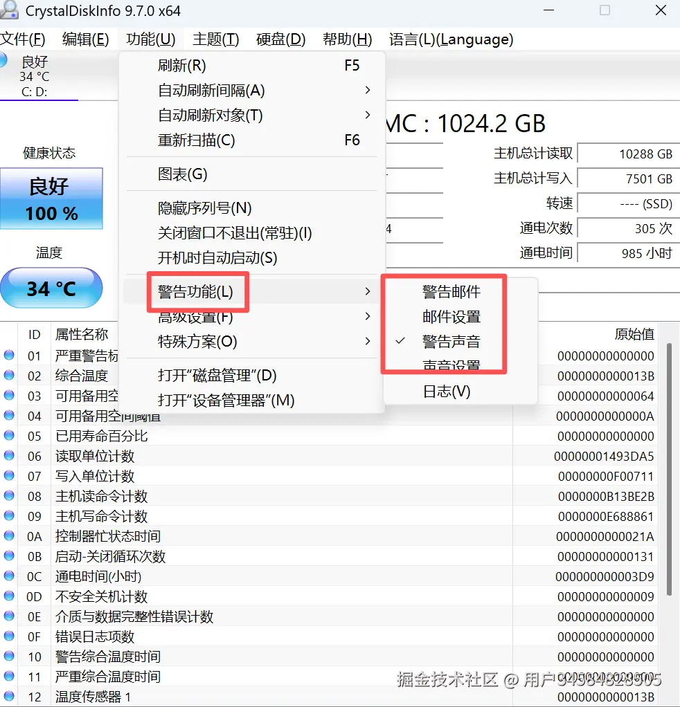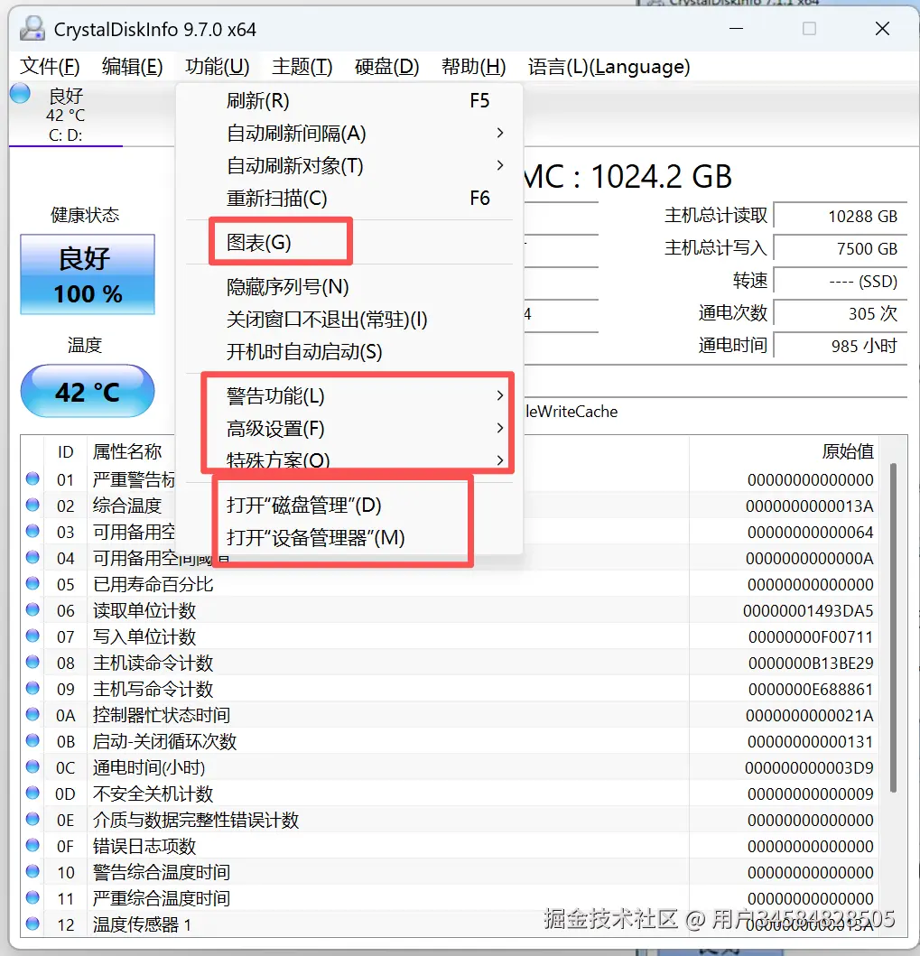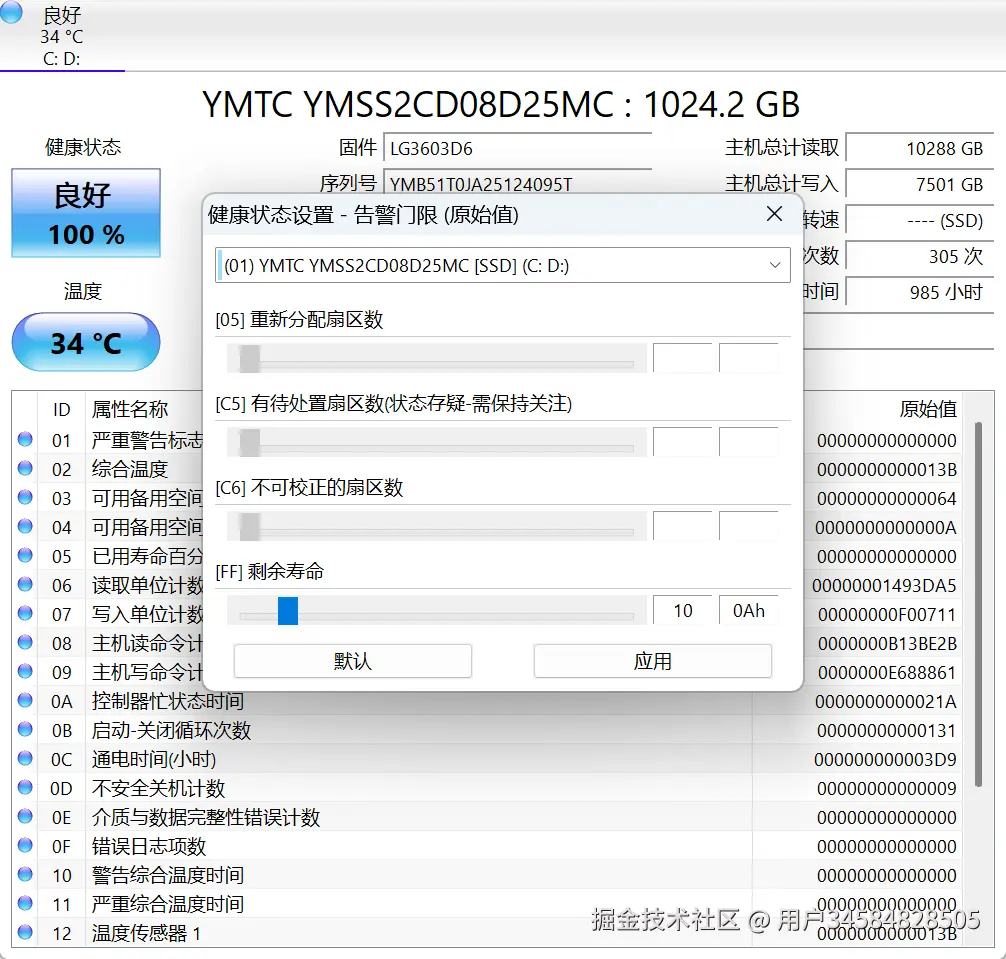 - 使用情况统计:提供了主机总计读取(10288GB)、总计写入(7500GB)、通电次数(305次)、通电时间(985小时)等数据,帮助用户掌握硬盘的使用程度。