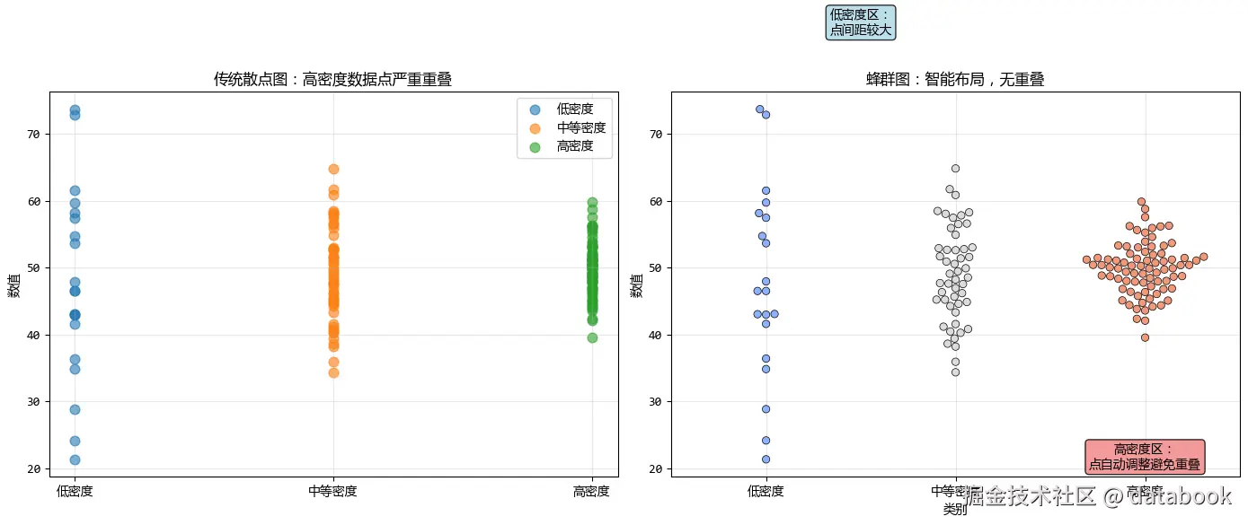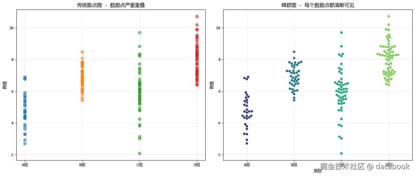 这就是蜂群图(Swarm Plot)的核心理念——在有限的空间内展示所有数据点,让每个点都能被清晰看见。
