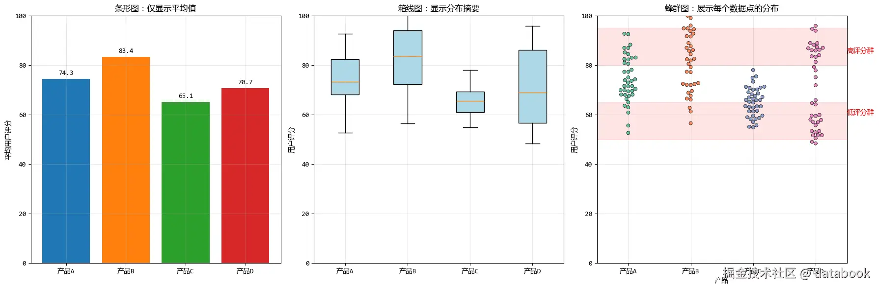 - 但只有蜂群图清晰地揭示了产品D实际上有两个明显的用户群体:一个低评分群体和一个高评分群体