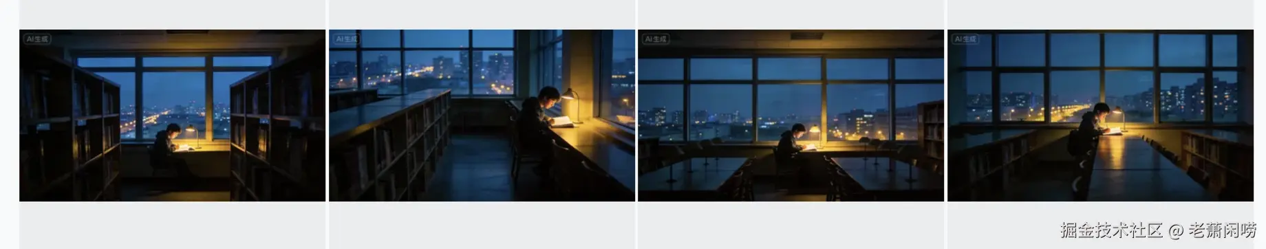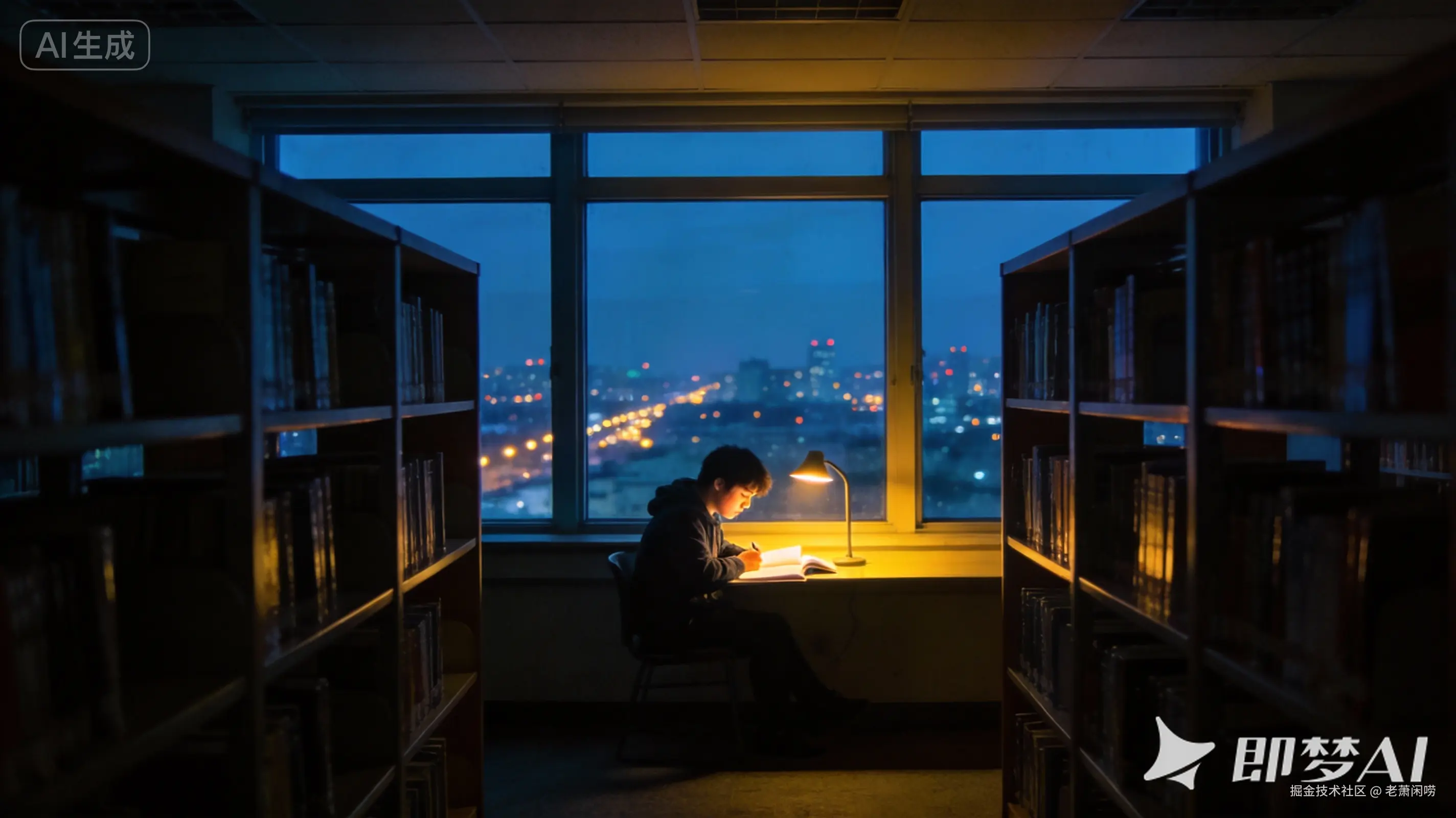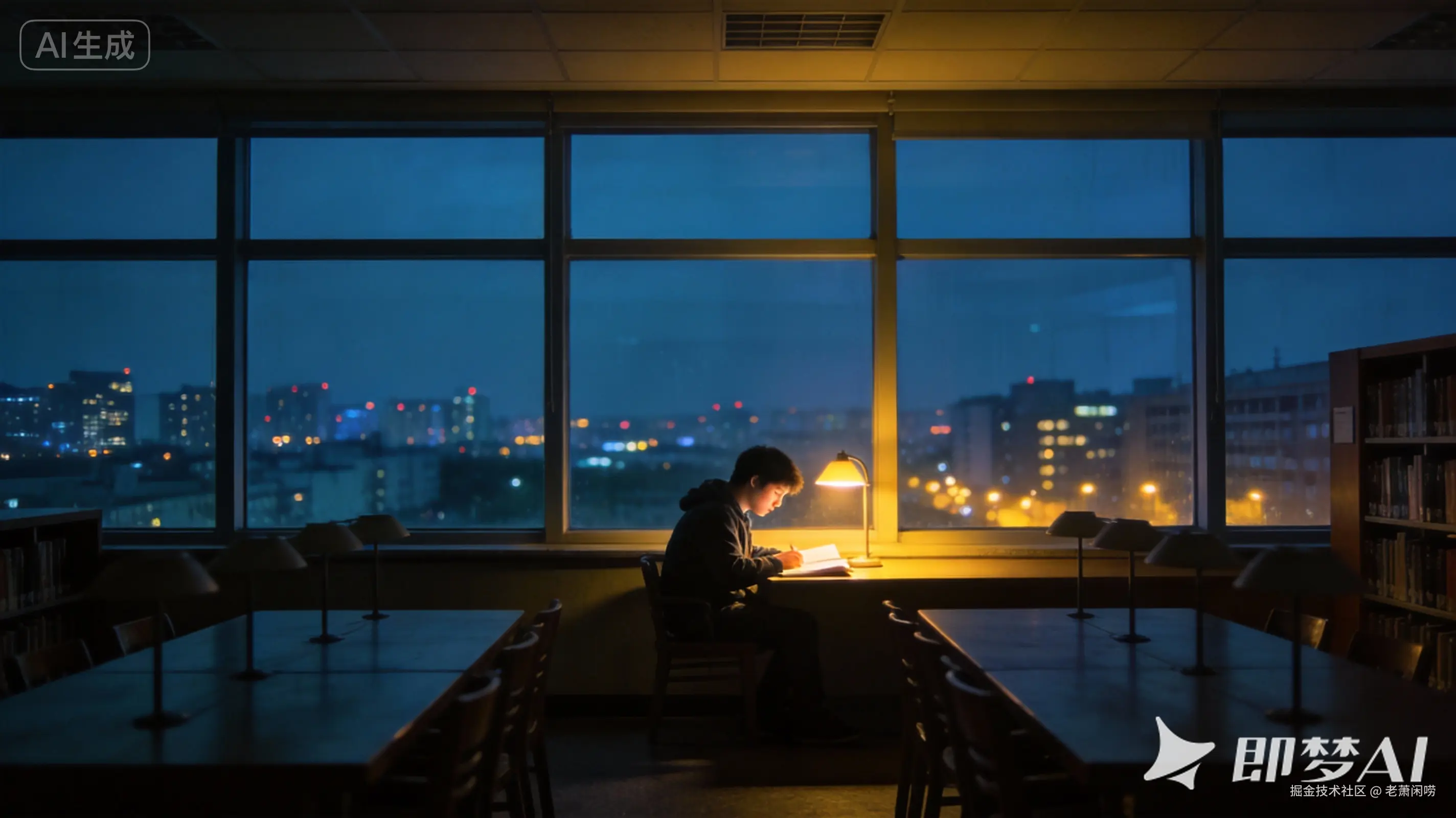 电影感,深夜的大学图书馆,空荡荡的,只有一个学生坐在窗边埋头苦读,窗外是城市的万家灯火,冷暖色对比,孤独但坚定的氛围,4k。