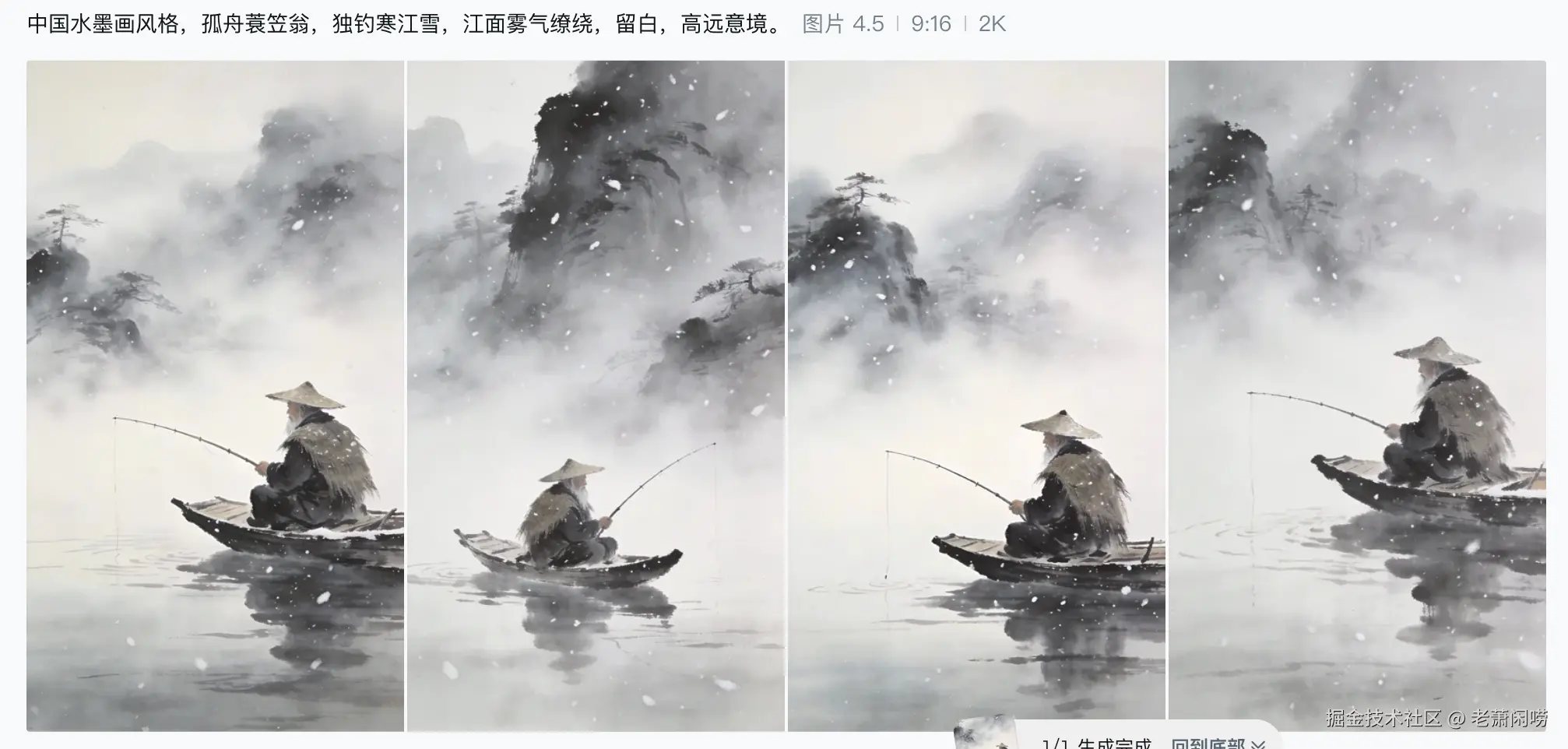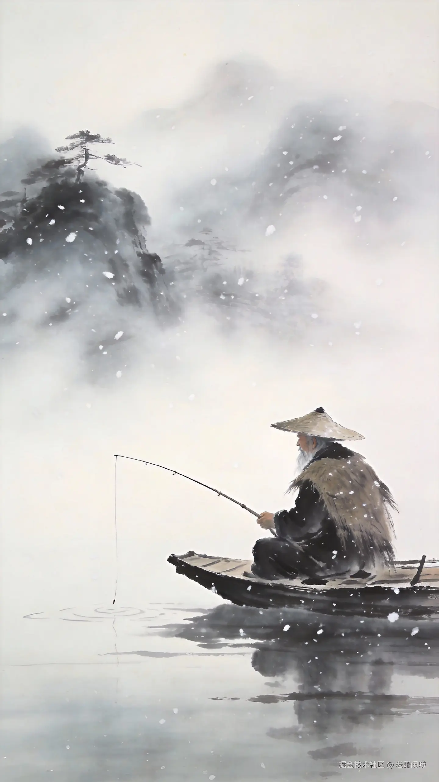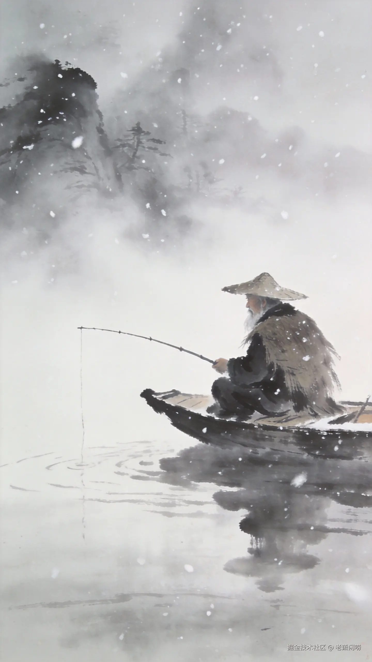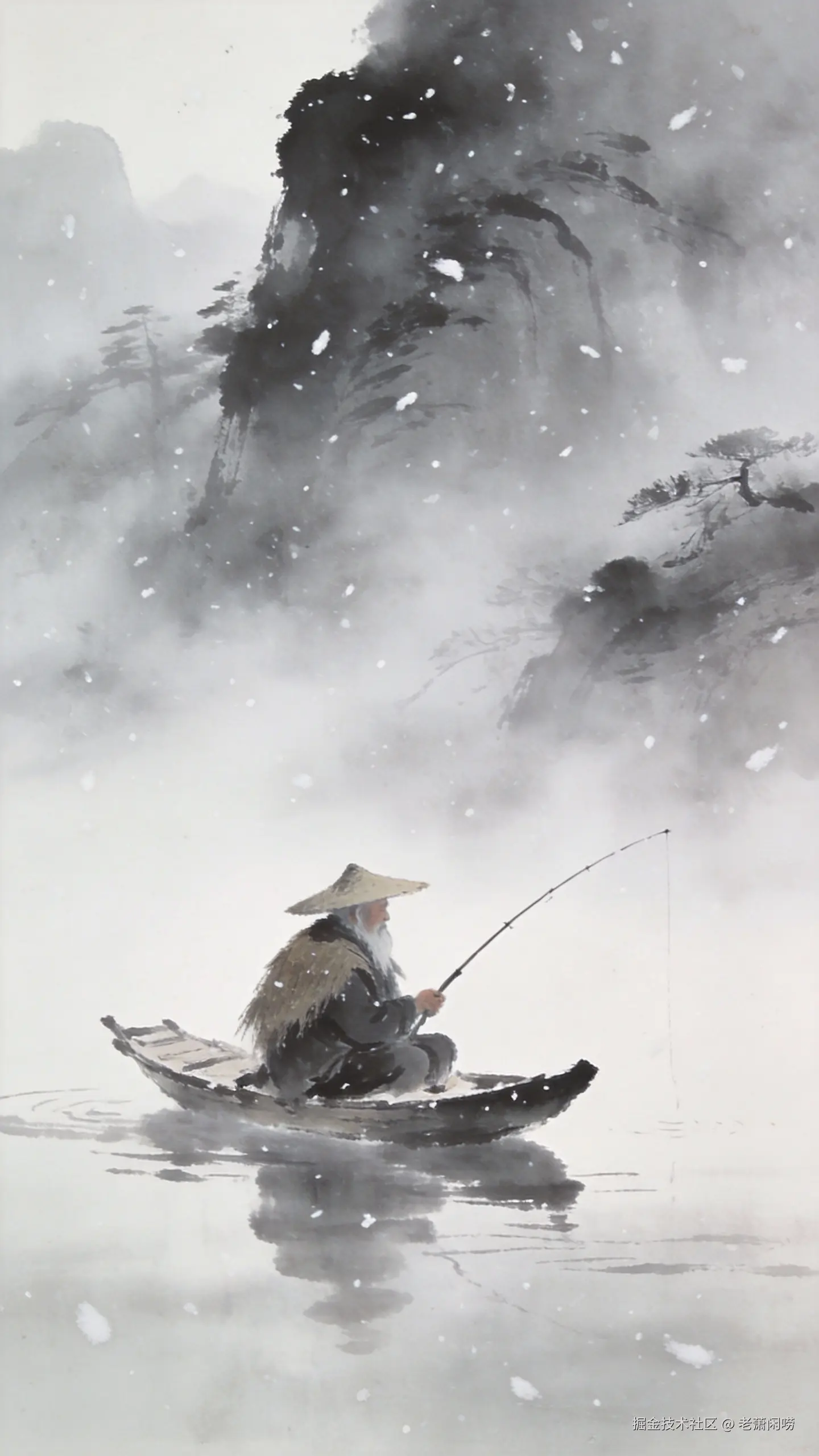 中国水墨画风格,孤舟蓑笠翁,独钓寒江雪,江面雾气缭绕,留白,高远意境。