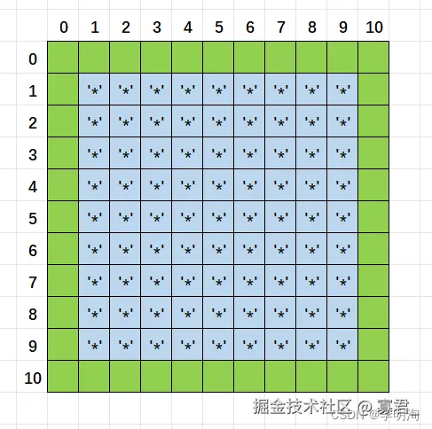 我们写的是9x9的,所以定位9,若果想写更大的,直接在这里面改就会很方便。因为要标上坐标,上下左右都会多出来一行,因此还要有11x11,所以下面加2