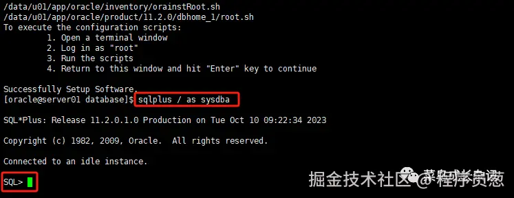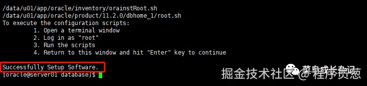 7.5、脚本执行完成后,再回到oracle安装的终端界面,回车。此时显示“Successfully Setup Software. ”则Oracle已经安装完成。