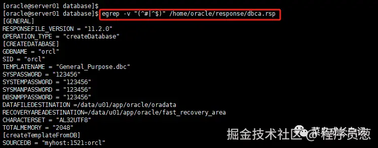 [oracle@server01 database] **egrep -v "(^#|^)" /home/oracle/response/dbca.rsp**