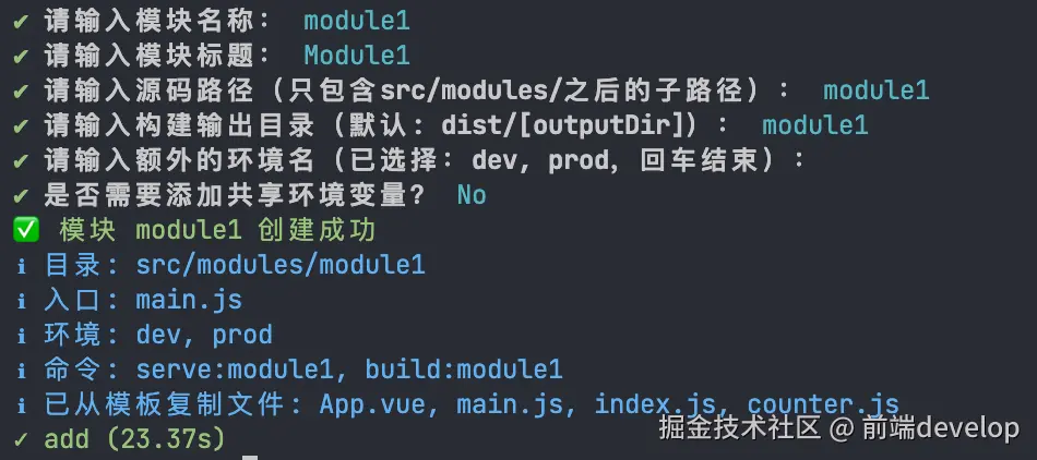 - 命令生成:在添加模块或环境时,自动生成对应的 npm 脚本命令,方便用户运行和构建模块。