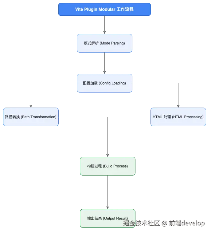 Vite Plugin Modular 的核心工作流程如下所示,通过 Vite 插件机制,在构建过程中动态解析模块和环境信息,实现模块化的配置管理和构建流程。