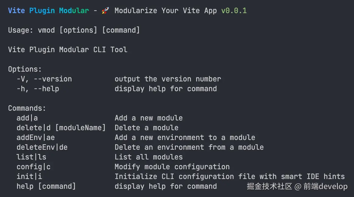 Vite Plugin Modular 允许在单个项目中管理多个独立的功能模块,每个模块都有自己的源码目录、入口文件和配置。通过命令行工具,开发者可以轻松添加、删除和管理模块: