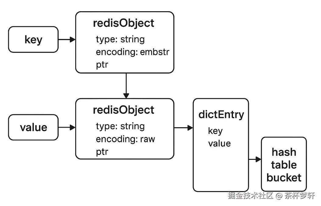└── val -> redisObject(type=string, encoding=embstr, ptr->SDS("hello"))