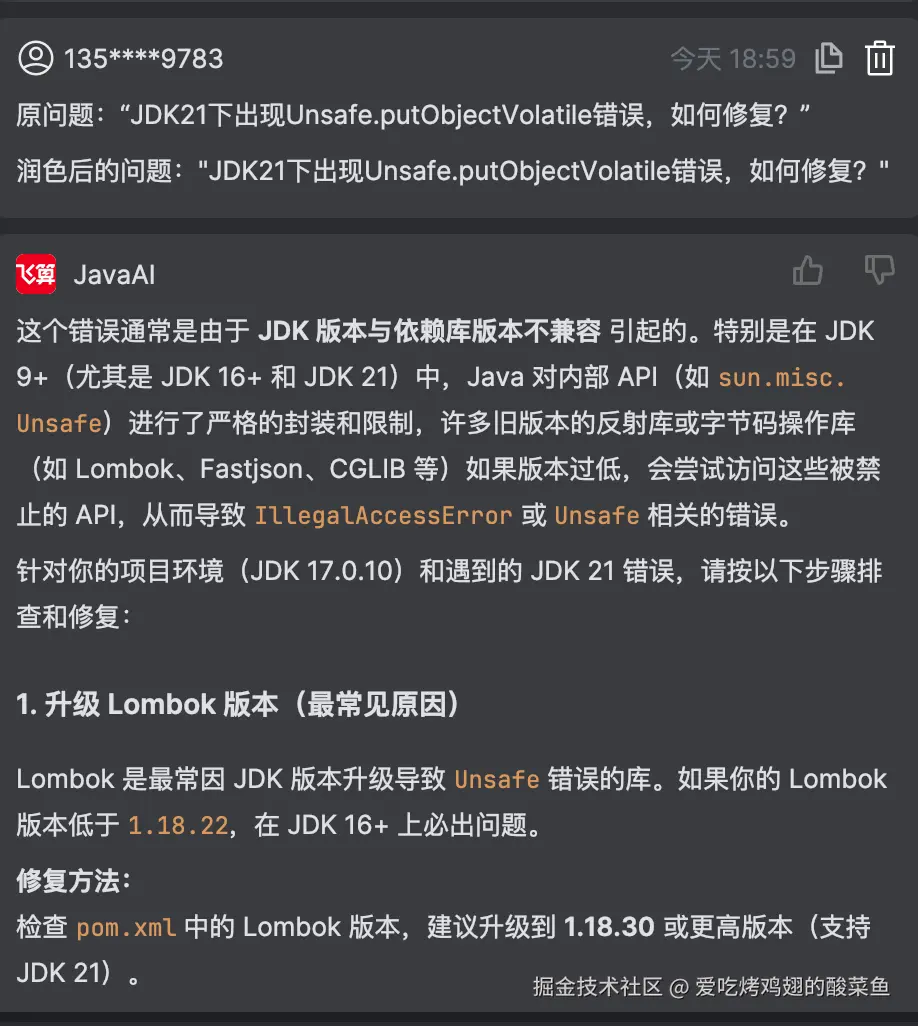 AI立刻识别出这是Netty版本与JDK21不兼容的问题,并给出三步解决方案: