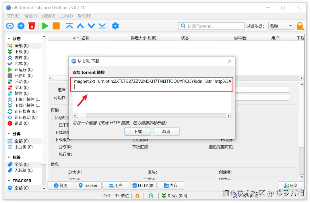 回到今天的磁力下载工具,点击左上角添加磁链,它会自动识别剪切板当中的链接。