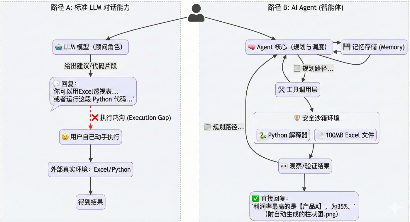 - LLM 对话能力:“你可以用 Excel 的透视表功能,或者写一段 Python 代码来分析……”(它给你方法,但你要自己动手)。