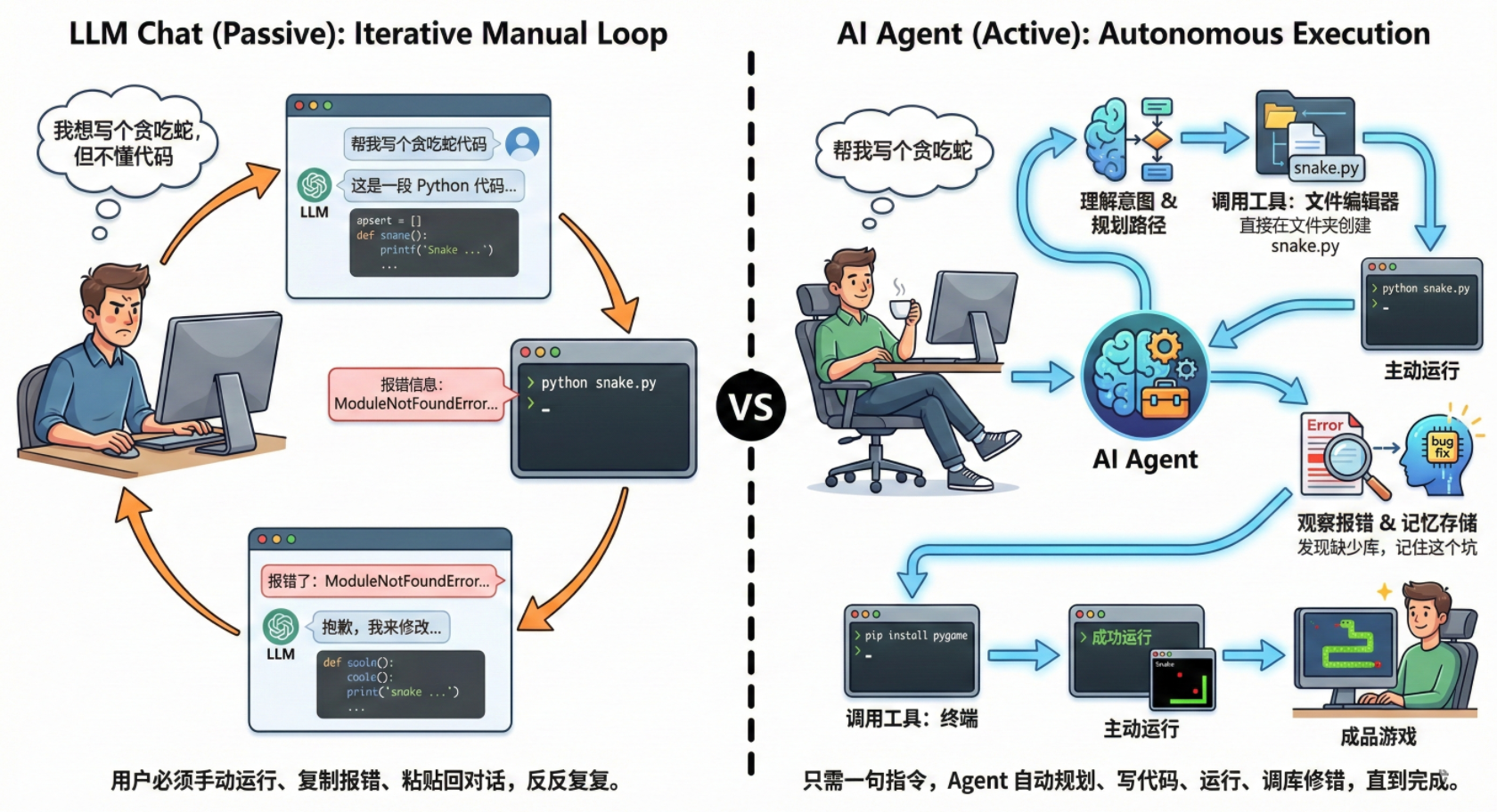 - AI Agent: 你只需要说一句“帮我写个贪吃蛇”,然后就可以去喝咖啡了。