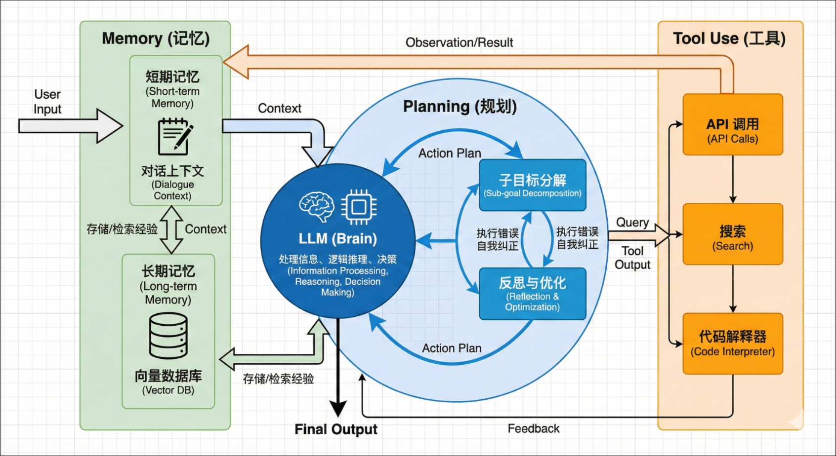 Agent(智能体) = 大脑 (LLM) + 双手 (Tools) + 记忆 (Memory) + 规划 (Planning)