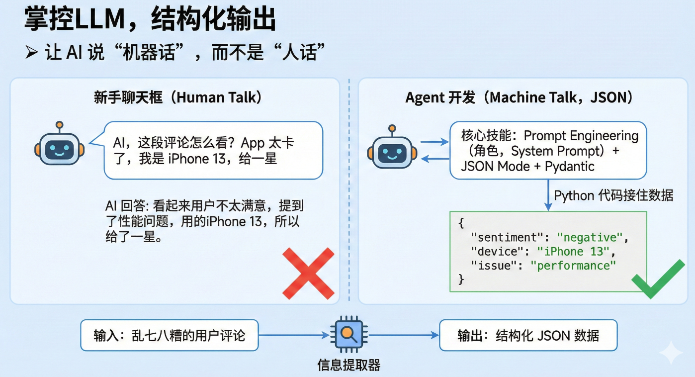 很多新手只会在聊天框里问 AI 问题。但程序无法处理 AI 随心所欲的回答。 Agent 开发的第一课,是强迫 AI 输出结构化数据(JSON)。只有输出 JSON,你的 Python 代码才能接住数据,进行下一步逻辑处理。