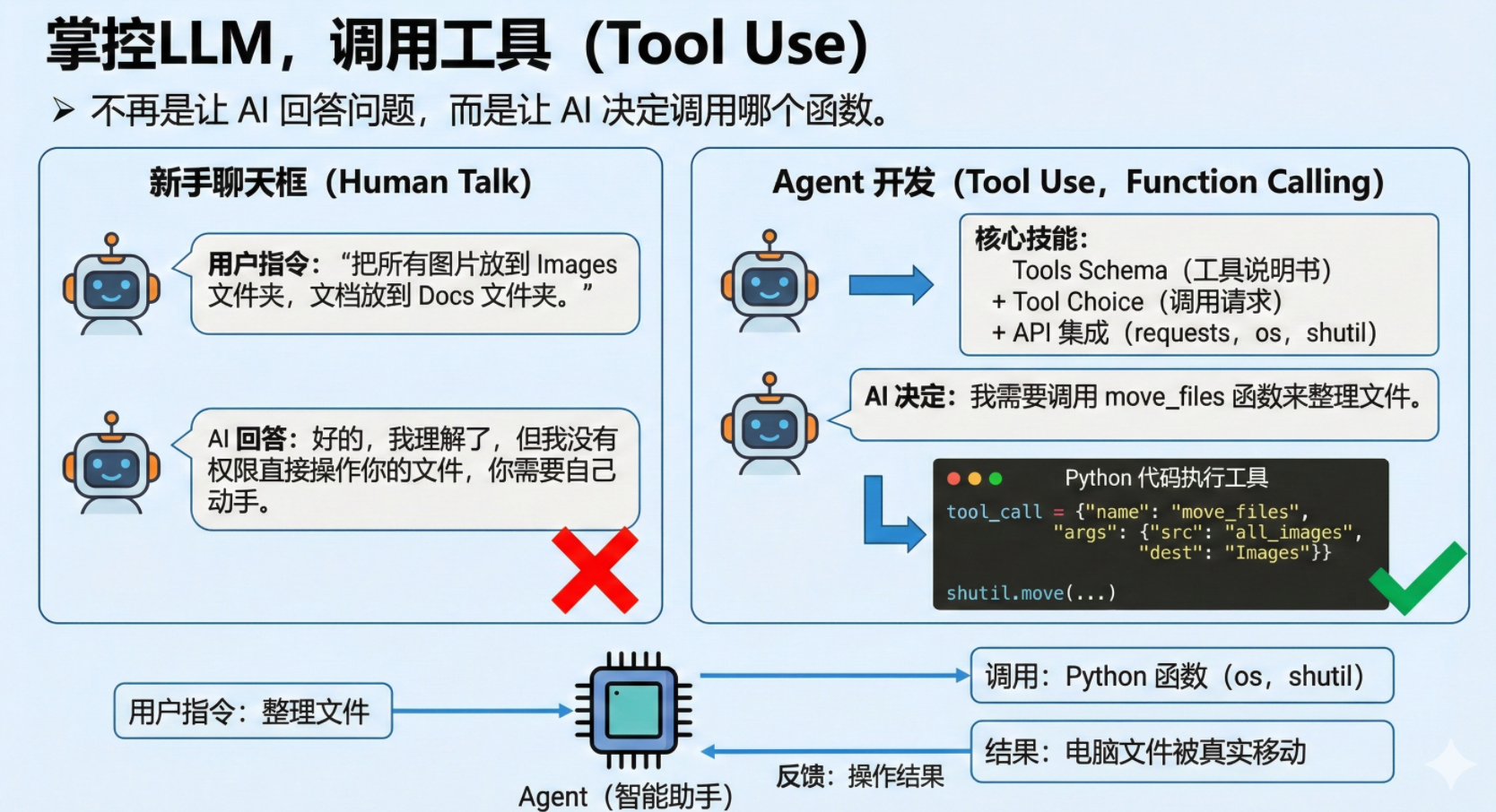 不再是让 AI 回答问题,而是让 AI 决定调用哪个函数。