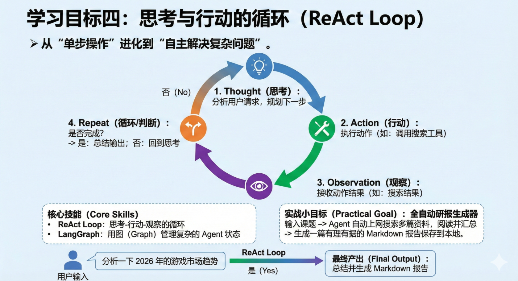 ReAct Loop:思考-行动-观察的循环。