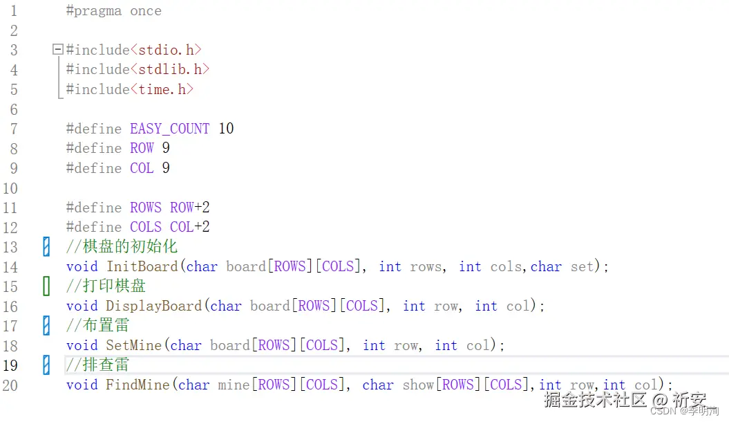 此时我们要布置雷了,因为是简单版的扫雷,所以我们布置10个雷。为了方便改变雷的数量时方便,我们定义一个宏