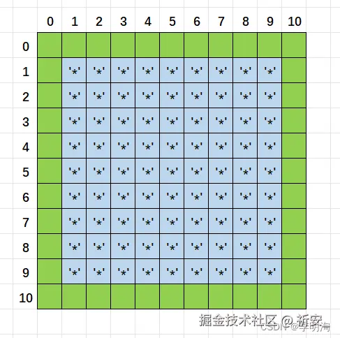 我们将‘1’作为雷,‘0’是没有雷,‘*’是玩家开始游戏时,所看到的,其是未知的。