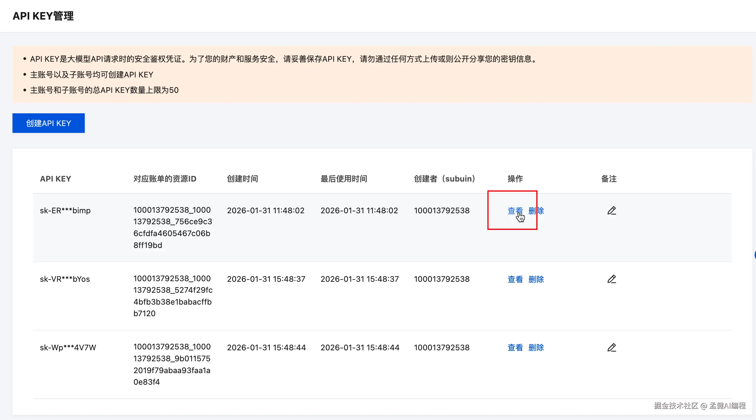 点击 API Key 管理页,创建一个 API Key