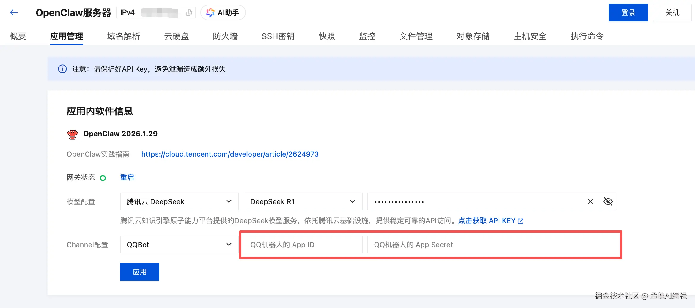 在腾讯云控制台找到你刚买的服务器,进入 "应用管理" 页签——你会看到一个可视化的配置面板。