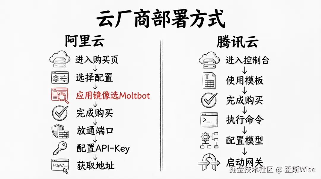 而腾讯云、阿里云接入之后,则是通过轻量的云端服务器,来通过钉钉、企微作为入口进行操作。
