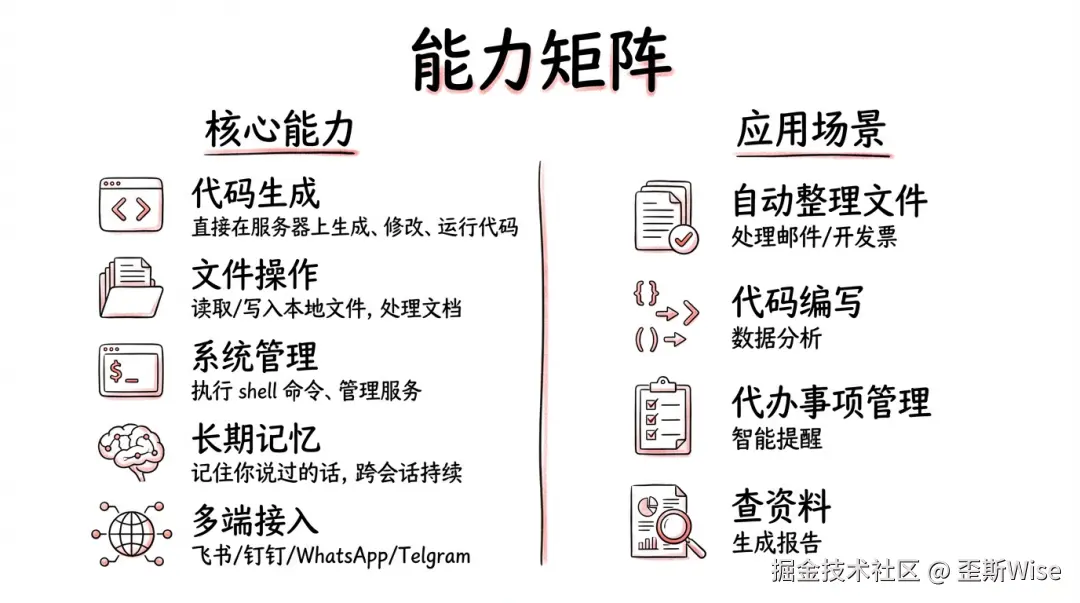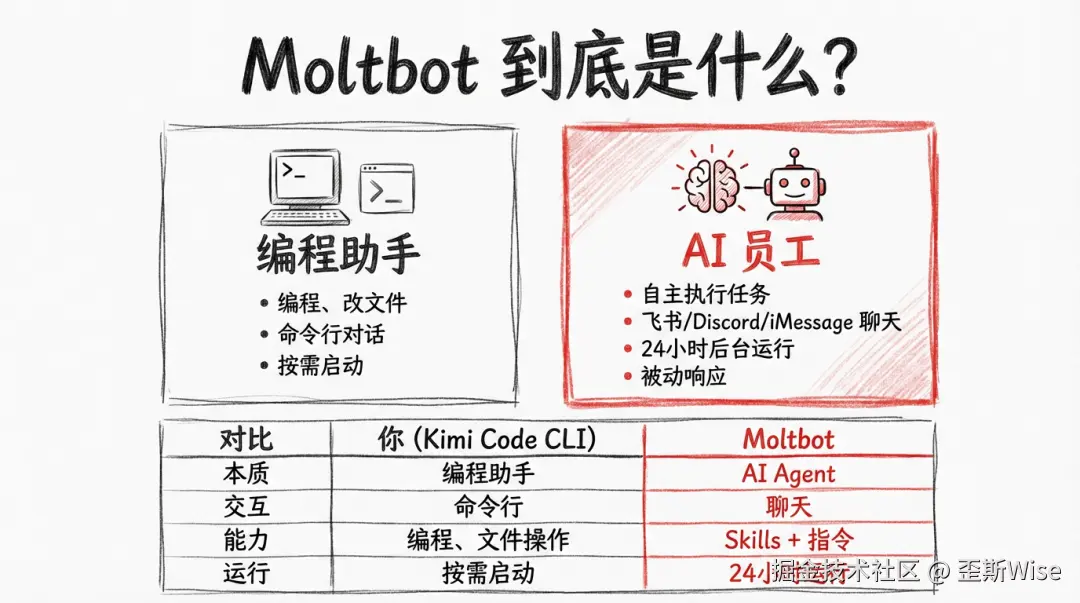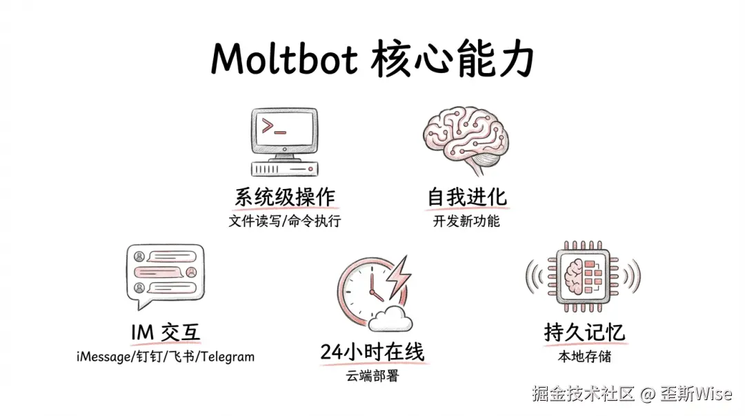 简而言之:Moltbot是一个能在服务器上跑的 AI,能真正干活的 Agent,不是只会聊天的废物。