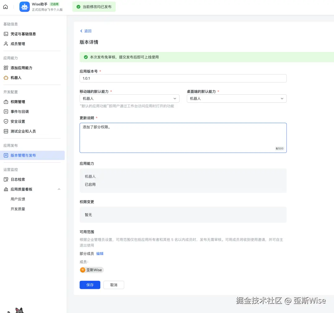 并且开通了消息、多维表格等乱七八糟的权限。