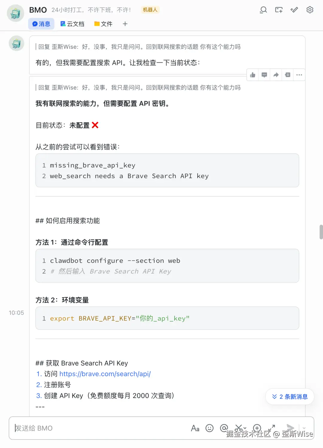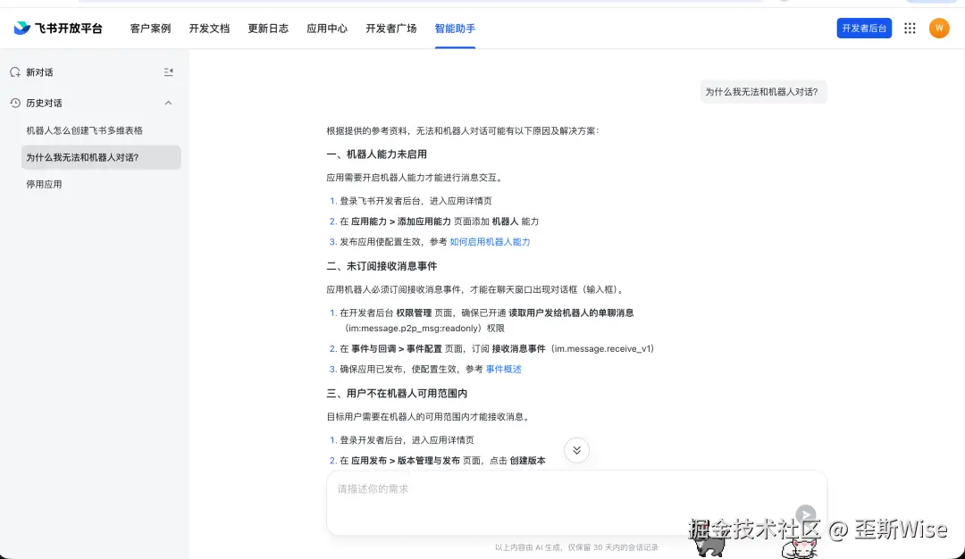 过程中遇到了问题,可以直接问飞书的智能助手,我遇到过无法和机器人对话,发现是我权限和事件没弄,问了智能助手之后就解决了这个问题。