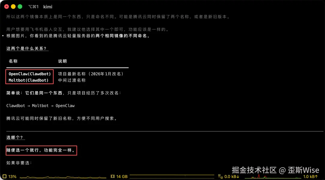 在买服务器的时候,这里Clawbot出现了2个,其实我不知道有什么区别,我继续去问Kimi,它是具备及视觉理解能力的,我很好奇它是否能否识别我的红框位置。