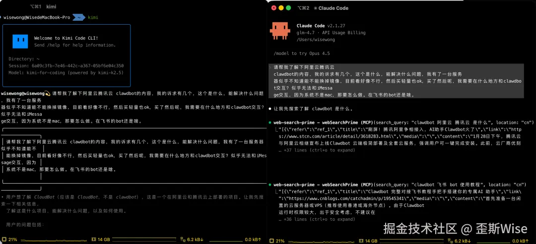 今天我们就用Clawbot这个最近很火的项目,用新出的Kimi code和Claude code(glm)来完成Clawbot从调研到部署,到应用的全过程。