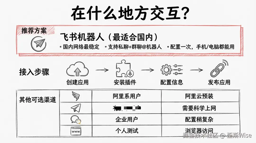 iMessage 只能在 Mac 上用,但服务器一般都是Linux,所以我们又要换种方式交互,目前企业用户基本都可以用企微、钉钉,非企业用户可能建议是用飞书的机器人或者在浏览器访问。