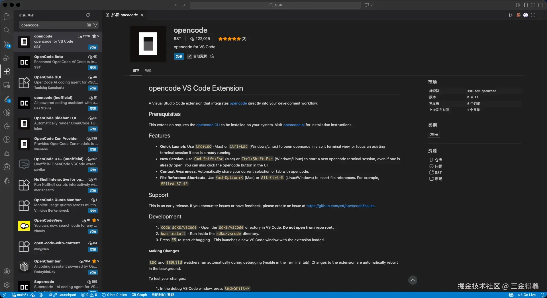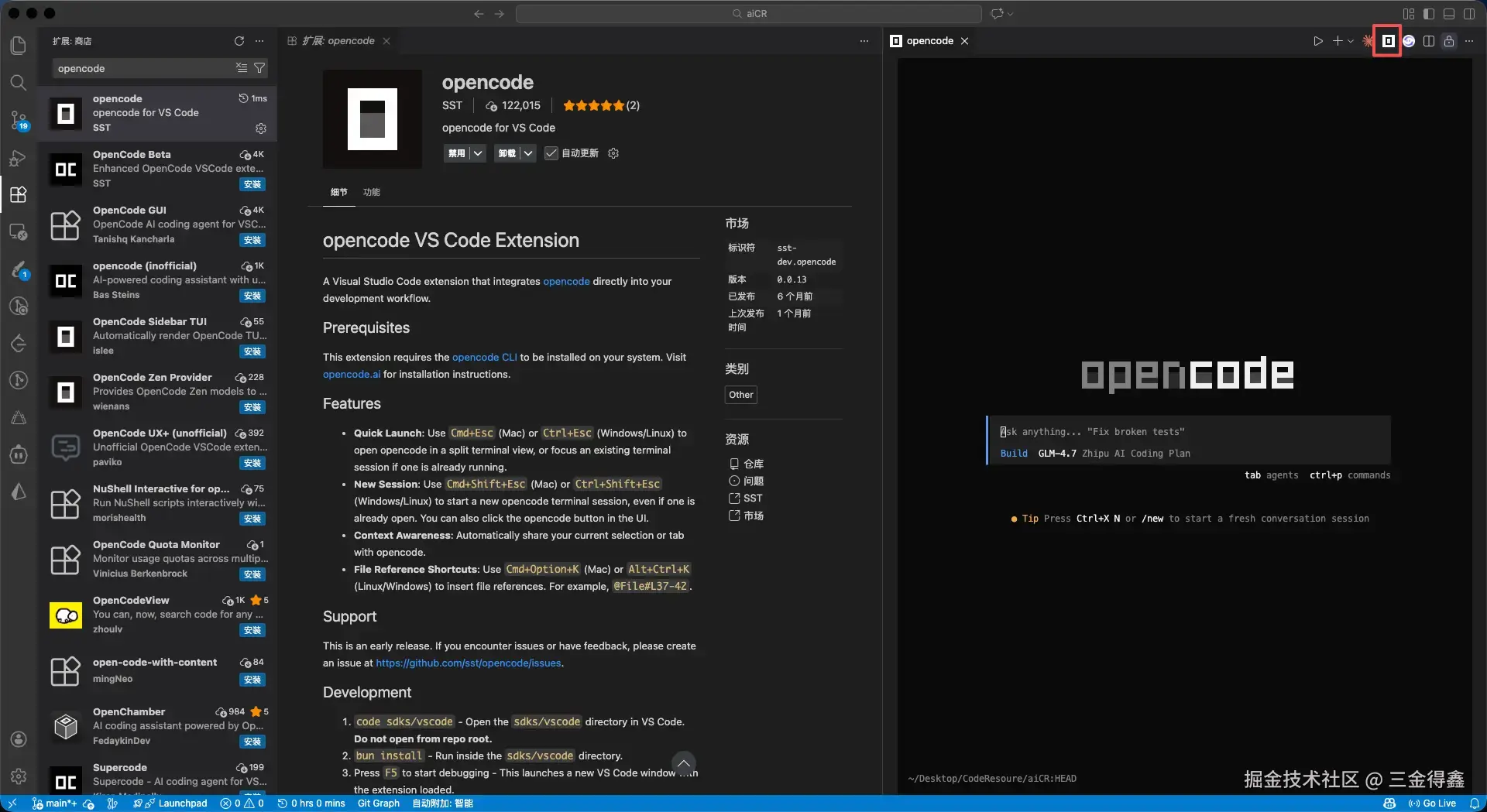 打开 VSCode 插件市场,并搜索 opencode,选下载数最多的那个: