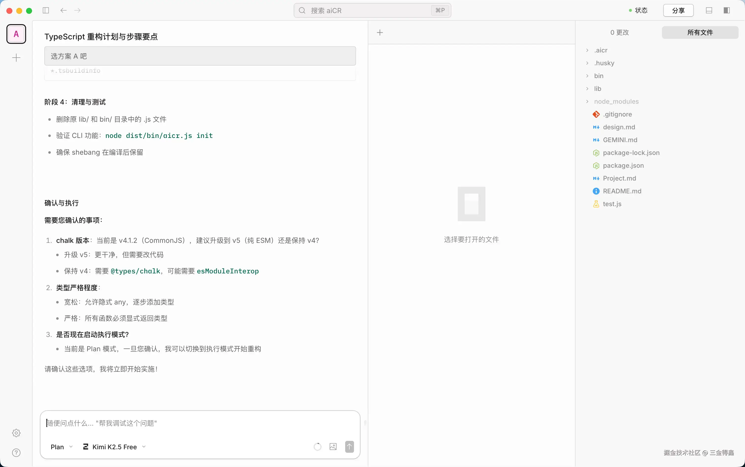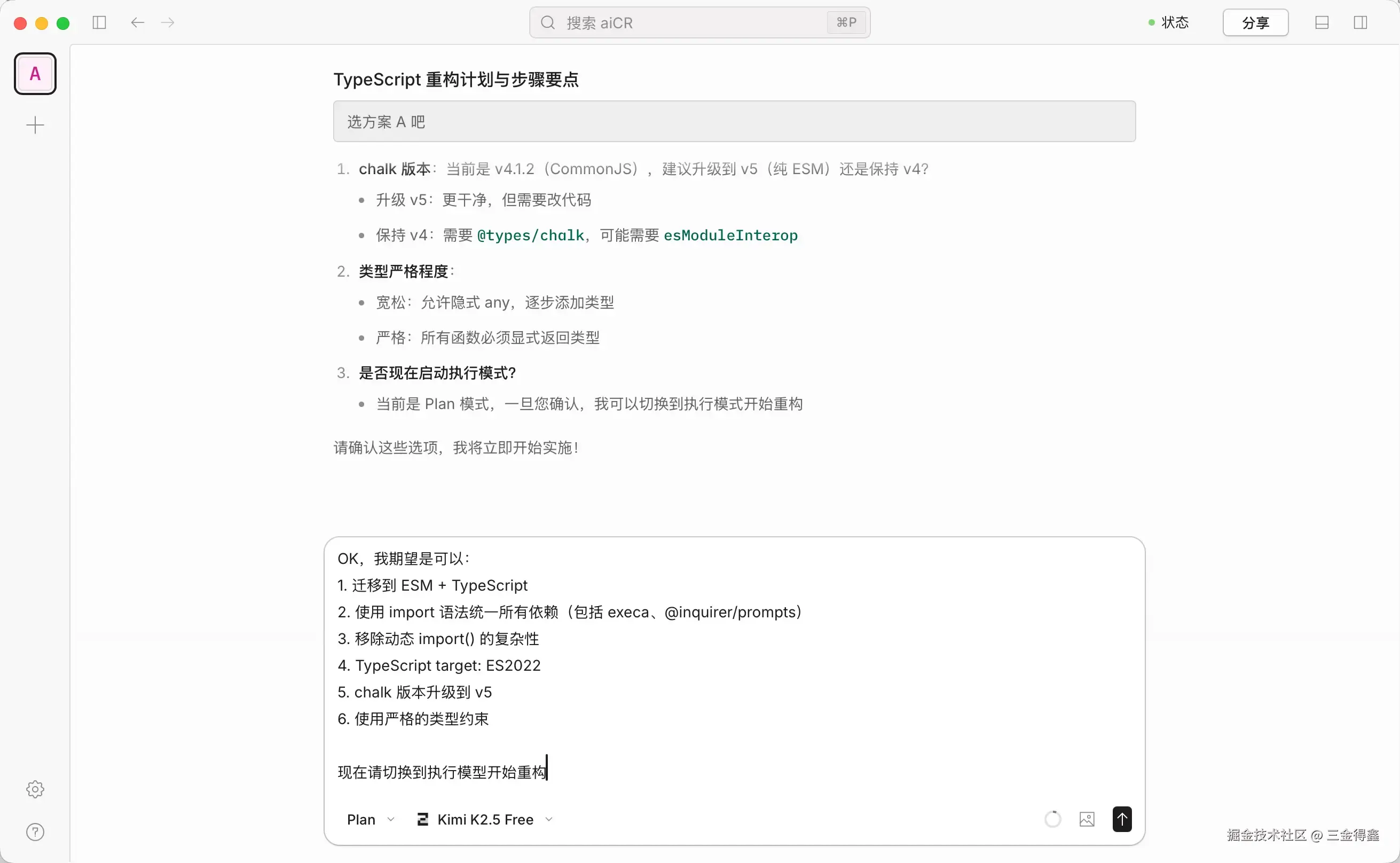 - 在 Plan 模式下,AI 会跟我来回沟通,确认重构方案。比如使用 ESM 还是使用 CommonJS?是升级依赖还是保持原有依赖版本。